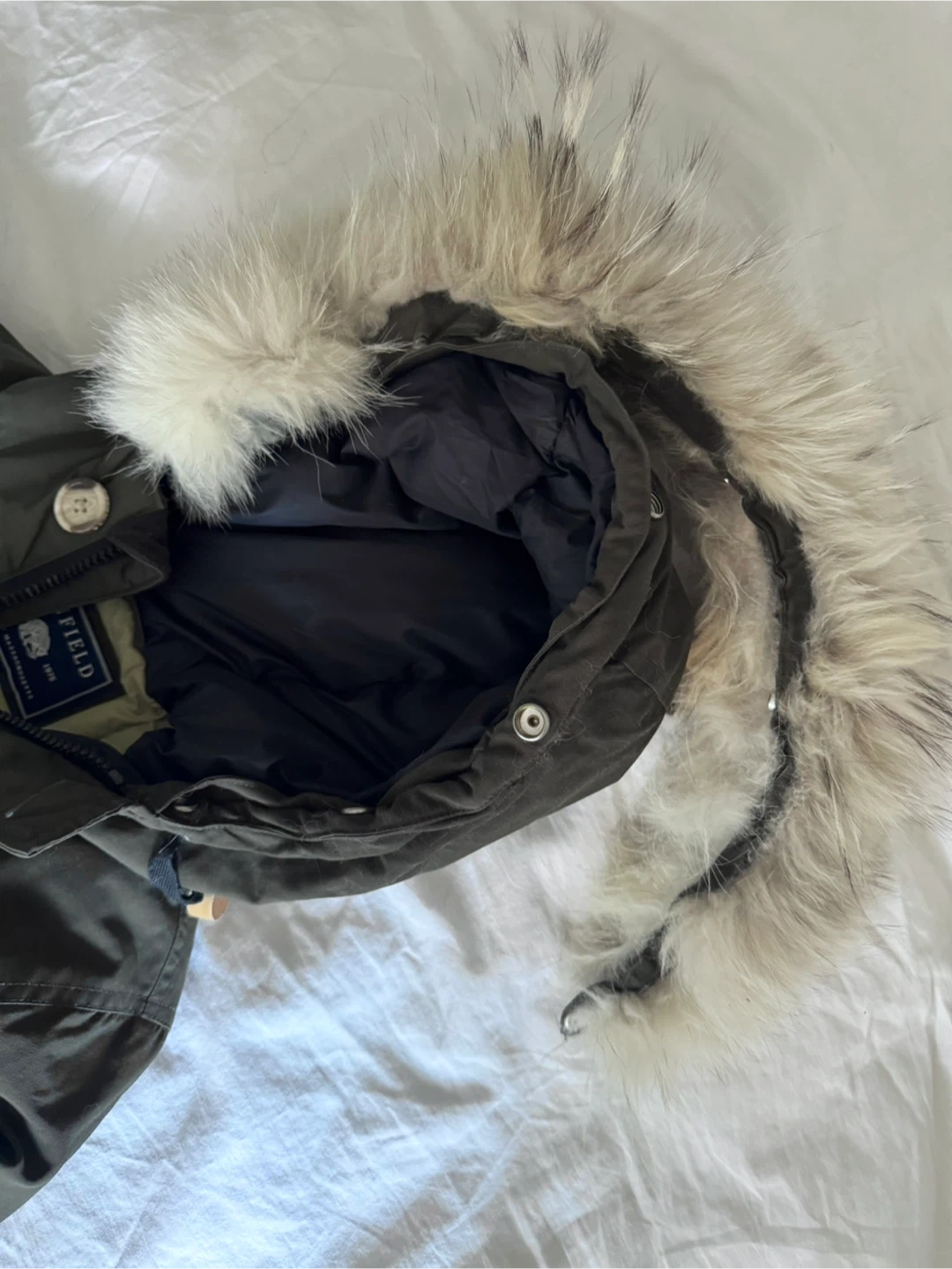 Lightly worn Penfield parka with detachable hood (snap buttons) real coyote fur trim in size S. Edge of the hood has a metal wire sewn in so that you can control the shape of the hood. There are strings with wooden Penfield beads on either side of the hood to tighten.