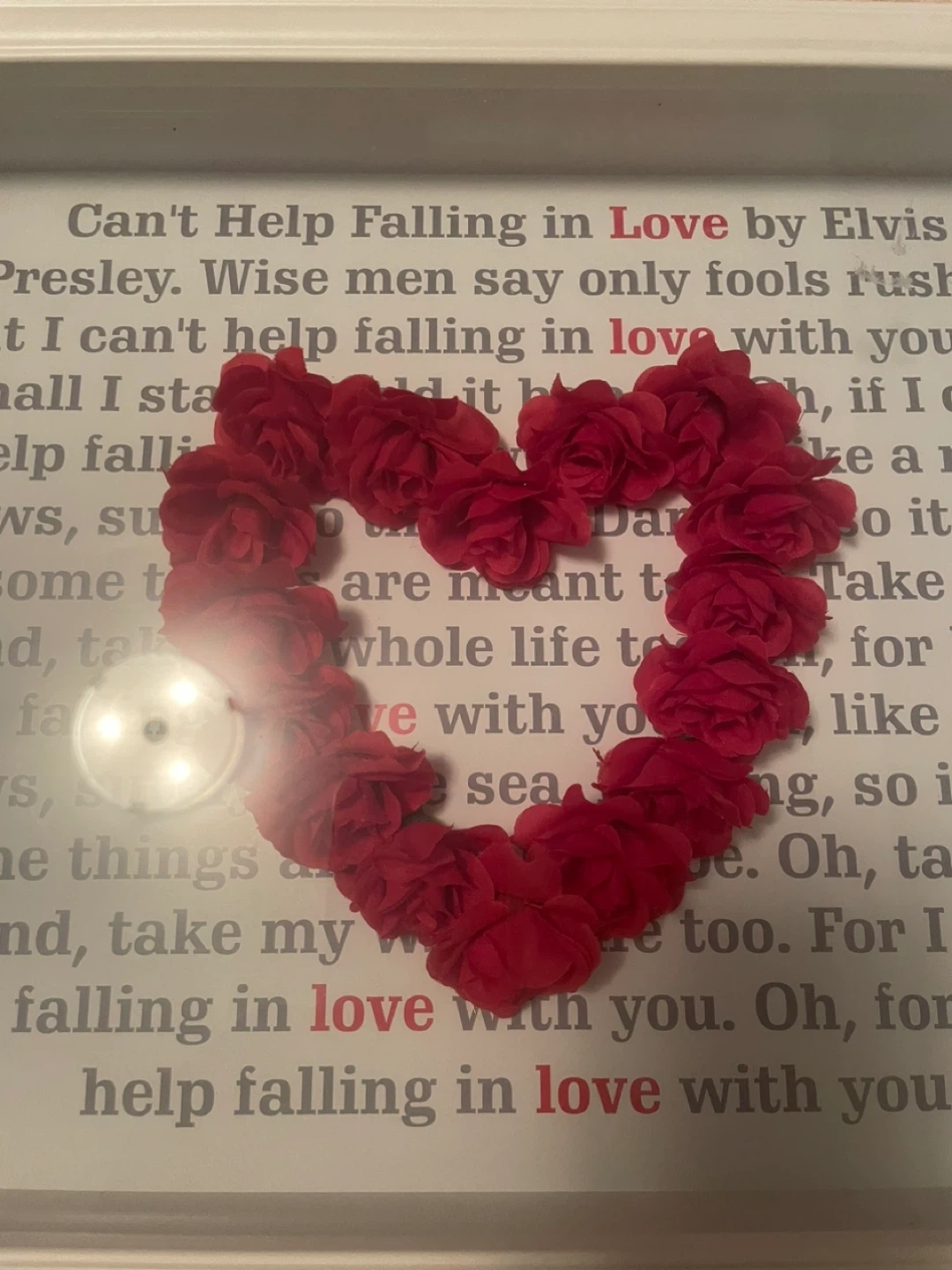 124A beautiful shadow box featuring a heart made of red roses, set against the lyrics of Elvis Presley's 'Can't Help Falling in Love' It's a lovely piece to add a touch of romance to any room Excellent condition. Great Elvis keepsake. No damage. Pick up is Jane and Lawrence. Cash only.