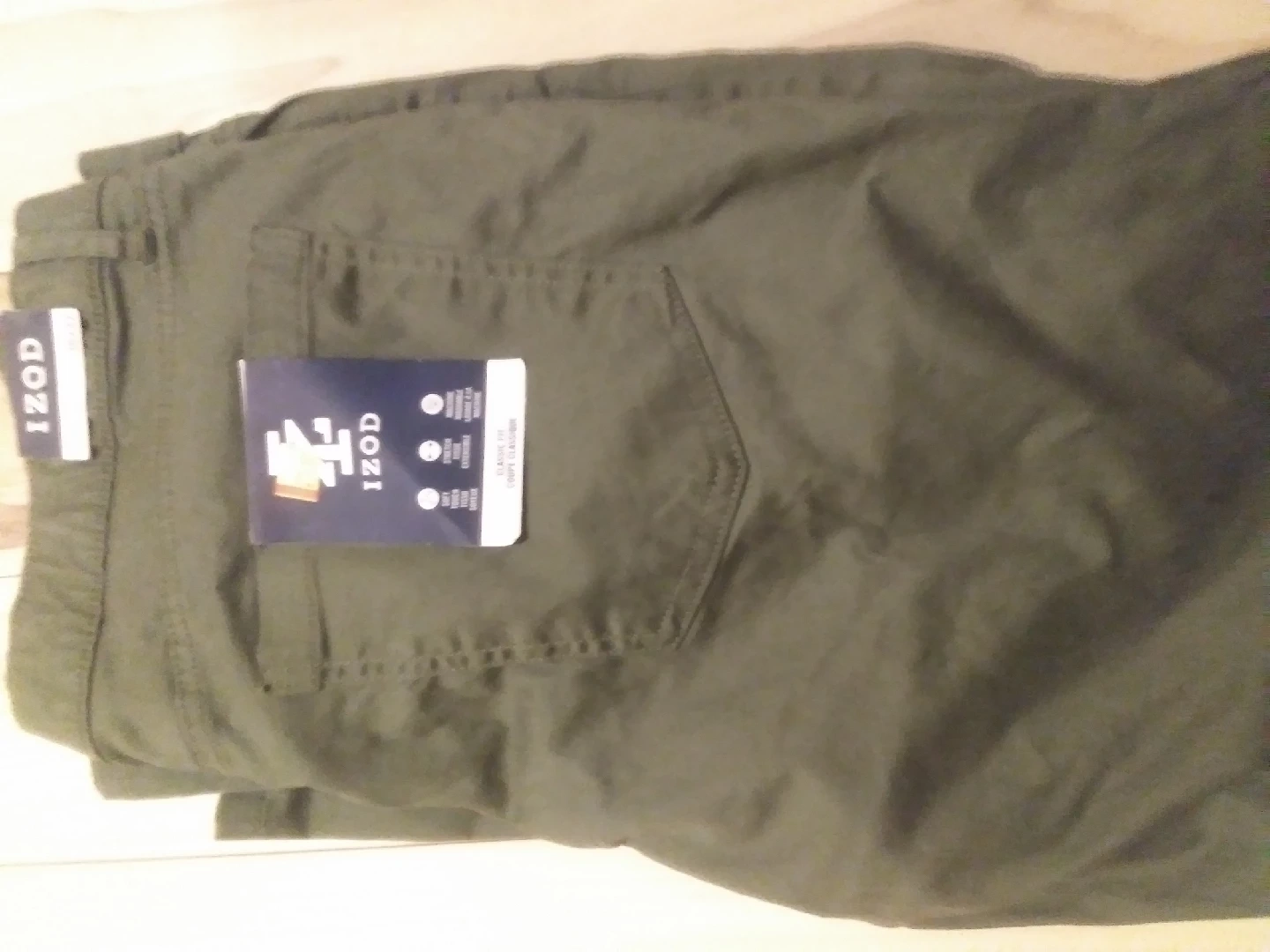 I'm selling a pair of IZOD pants in olive green. They appear to be in great condition and ready for a new home! Perfect for casual wear or outdoor activities