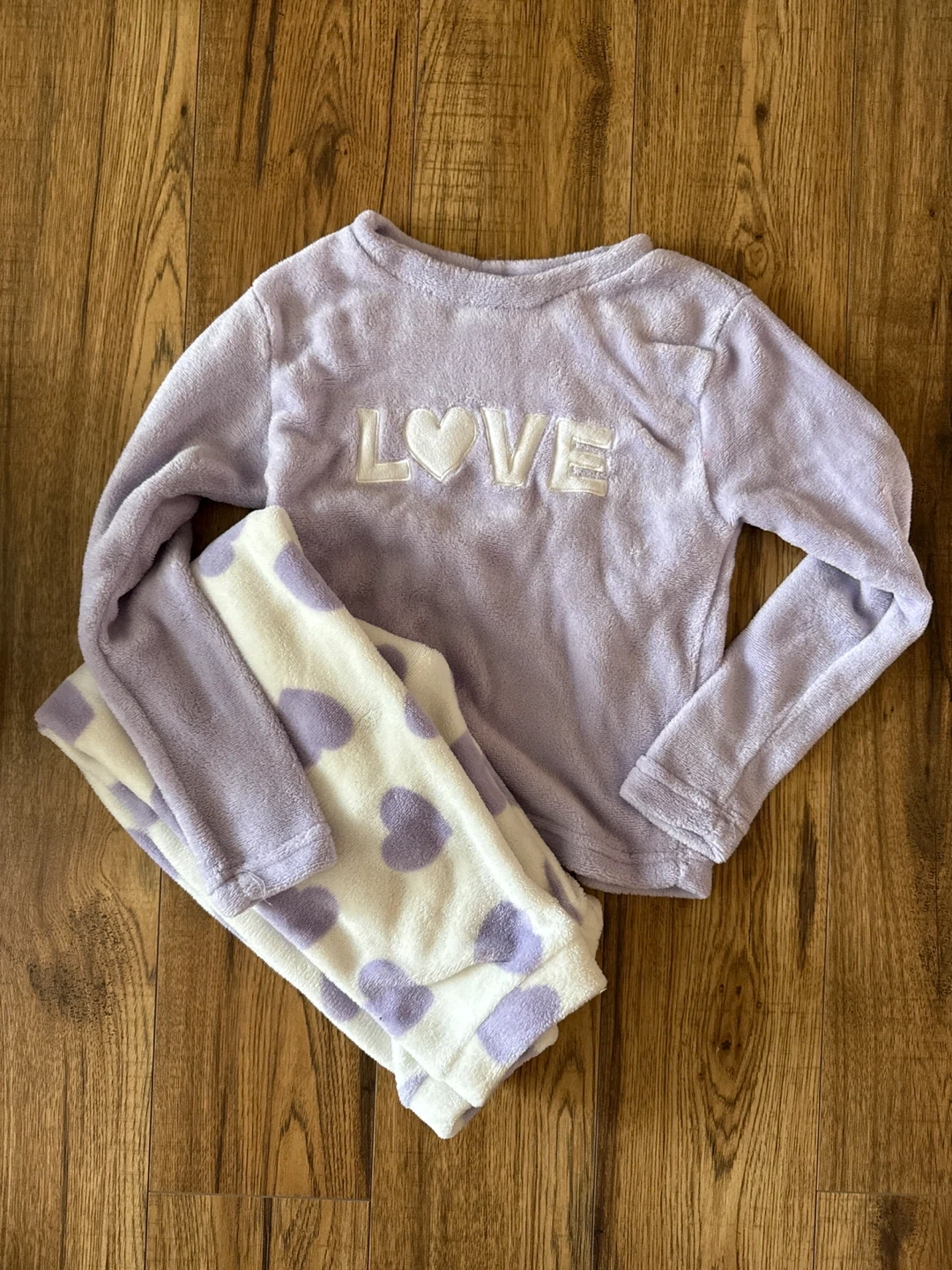80Kids Fuzzy pajama set! The set comes with soft, plush top with the word 'LOVE' and matching pants with a heart pattern. Size 7/9