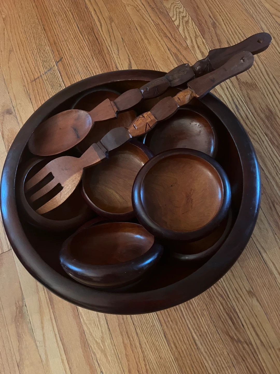 This beautiful vintage mahogany salad set bought in Haiti is in ‘as new’ condition. The diameter of the large bowl is 17” so with the 8 serving bowls and servers with carved decoration it is perfect for a party.