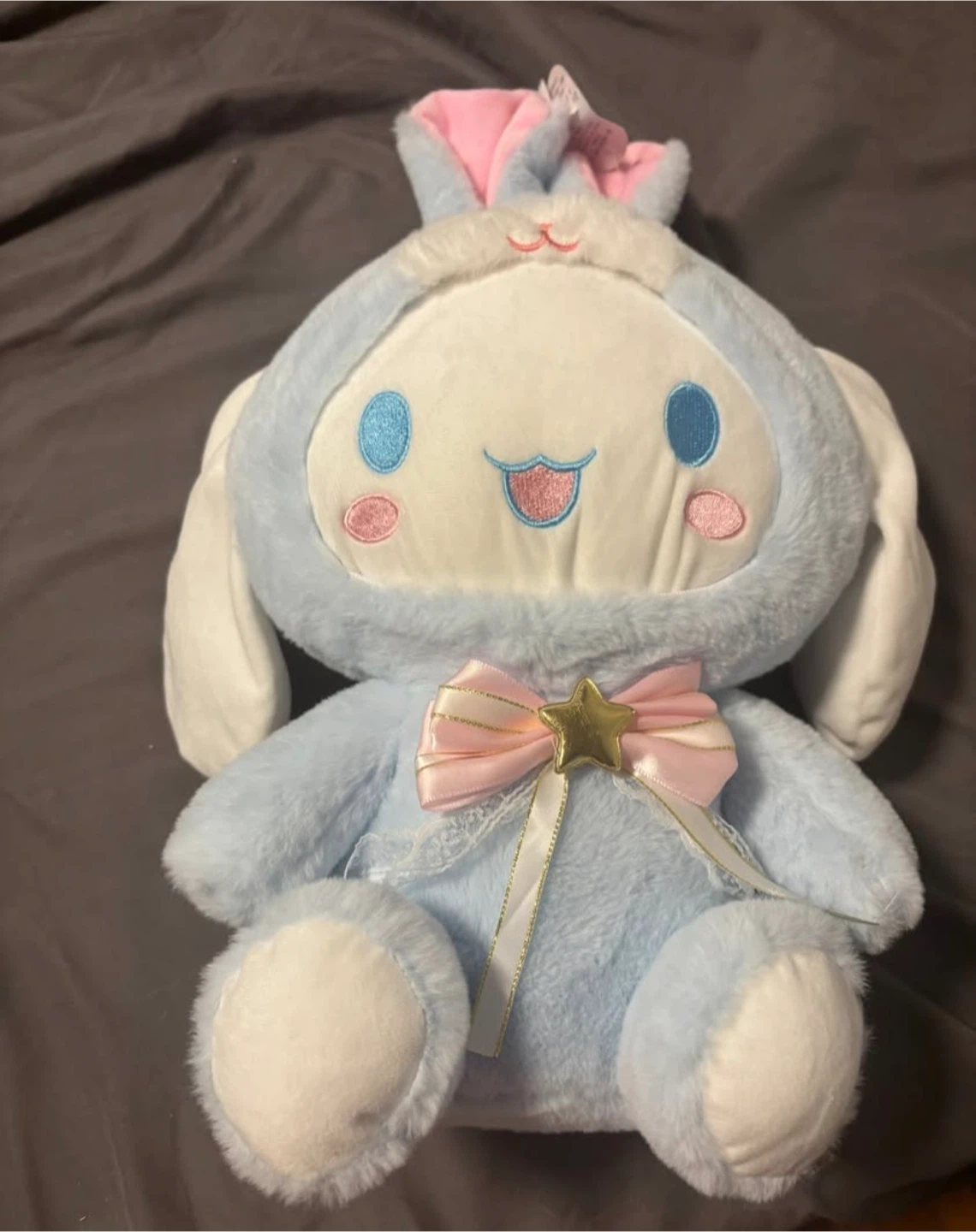Super cute, medium sized, Cinnamoroll plushie! It's a light blue colour and has a sweet little bunny hat and a pink and gold bow. Perfect for any Sanrio fan!