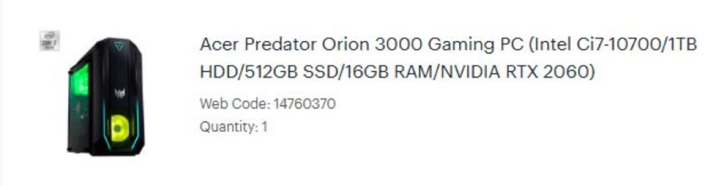 Acer Predator Orion 3000 Gaming PC (Intel Ci7-10700/1TB HDD/512GB SSD/16GB RAM/NVIDIA RTX 2060)