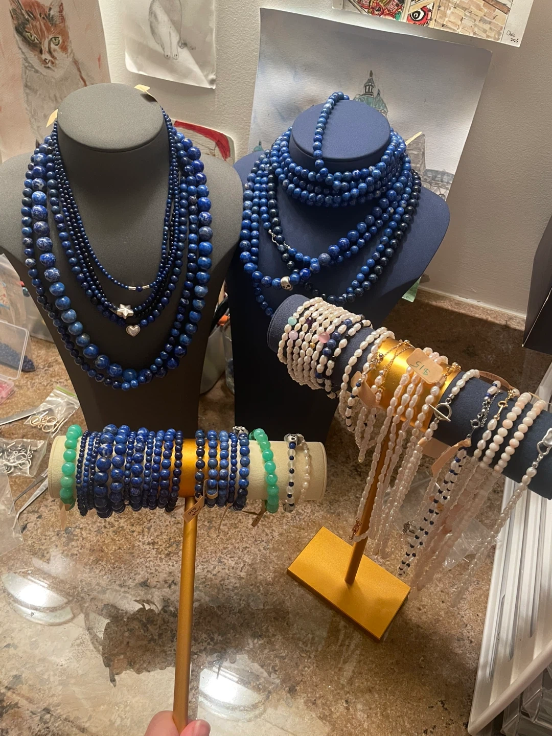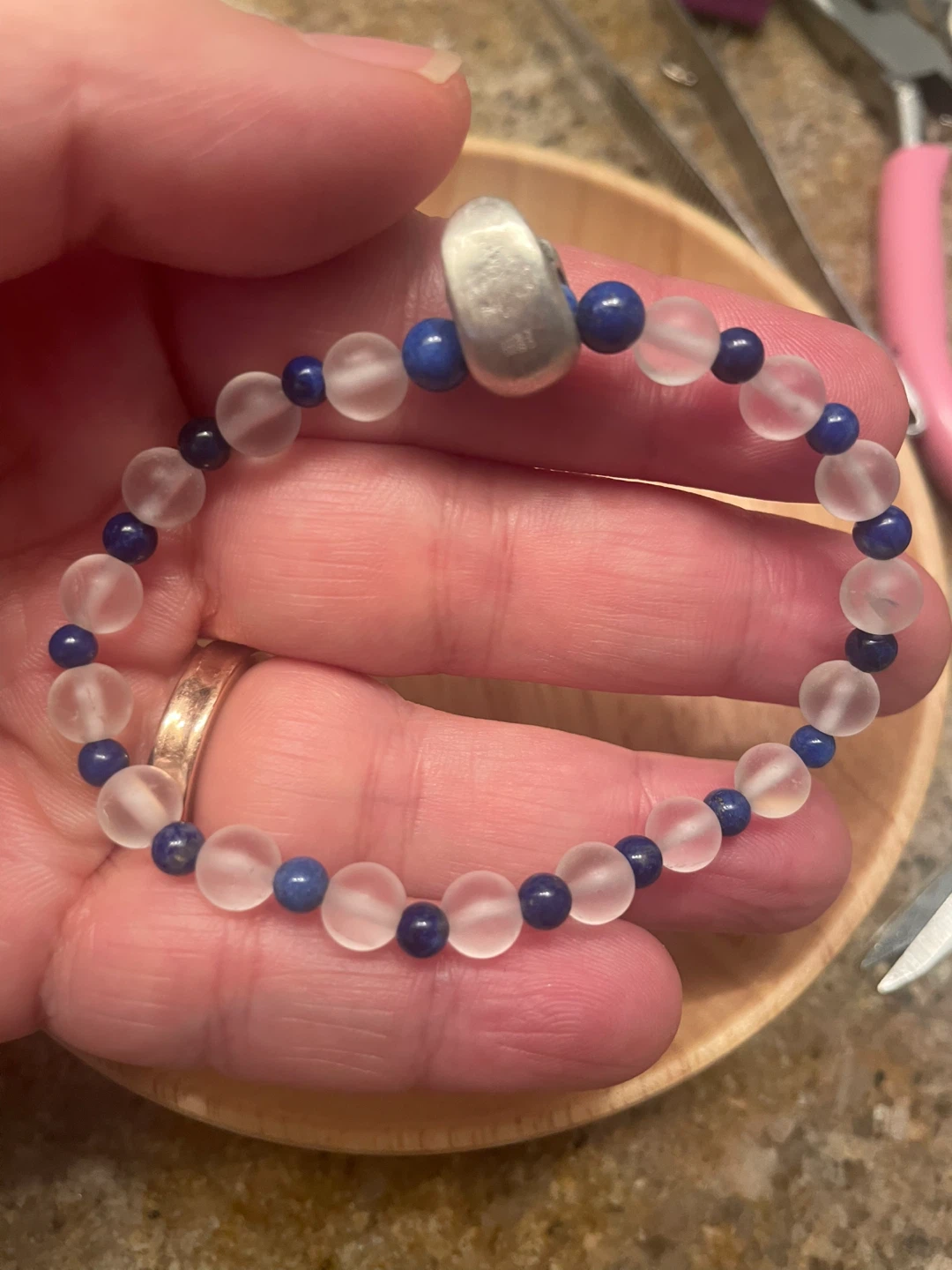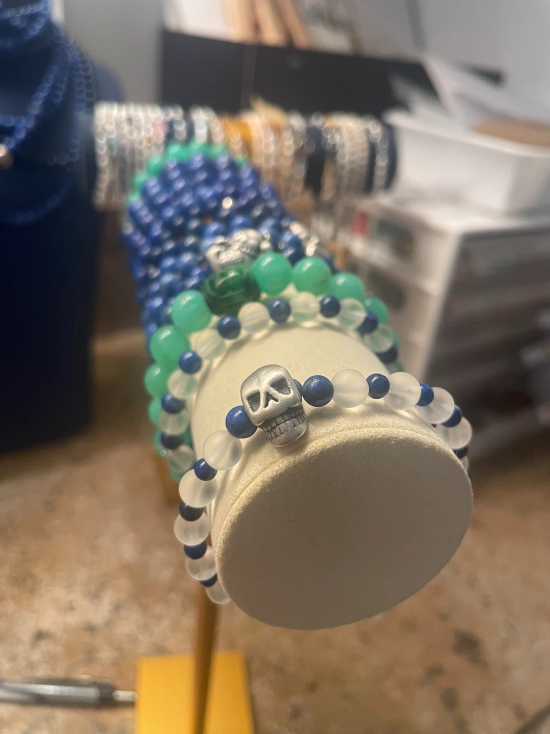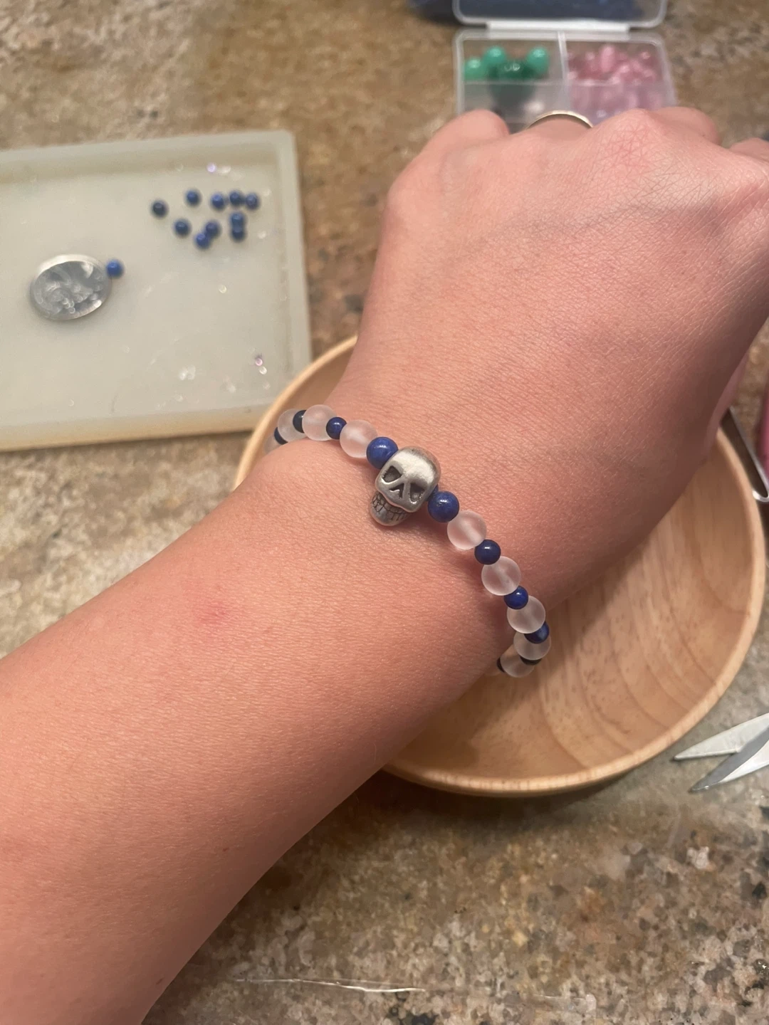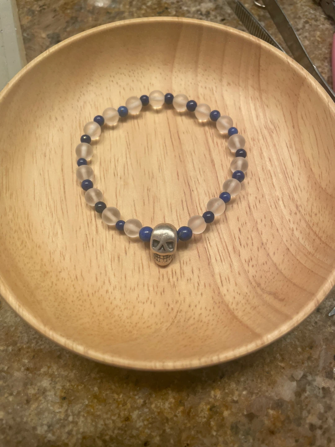 Check out this unique handmade bracelet! It features a mix of blue and frosted white beads, accented with a cool silver skull charm. Perfect for adding a bit of edge to your style
