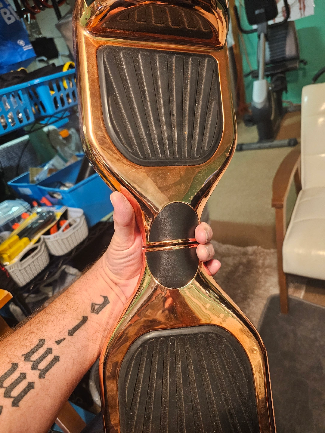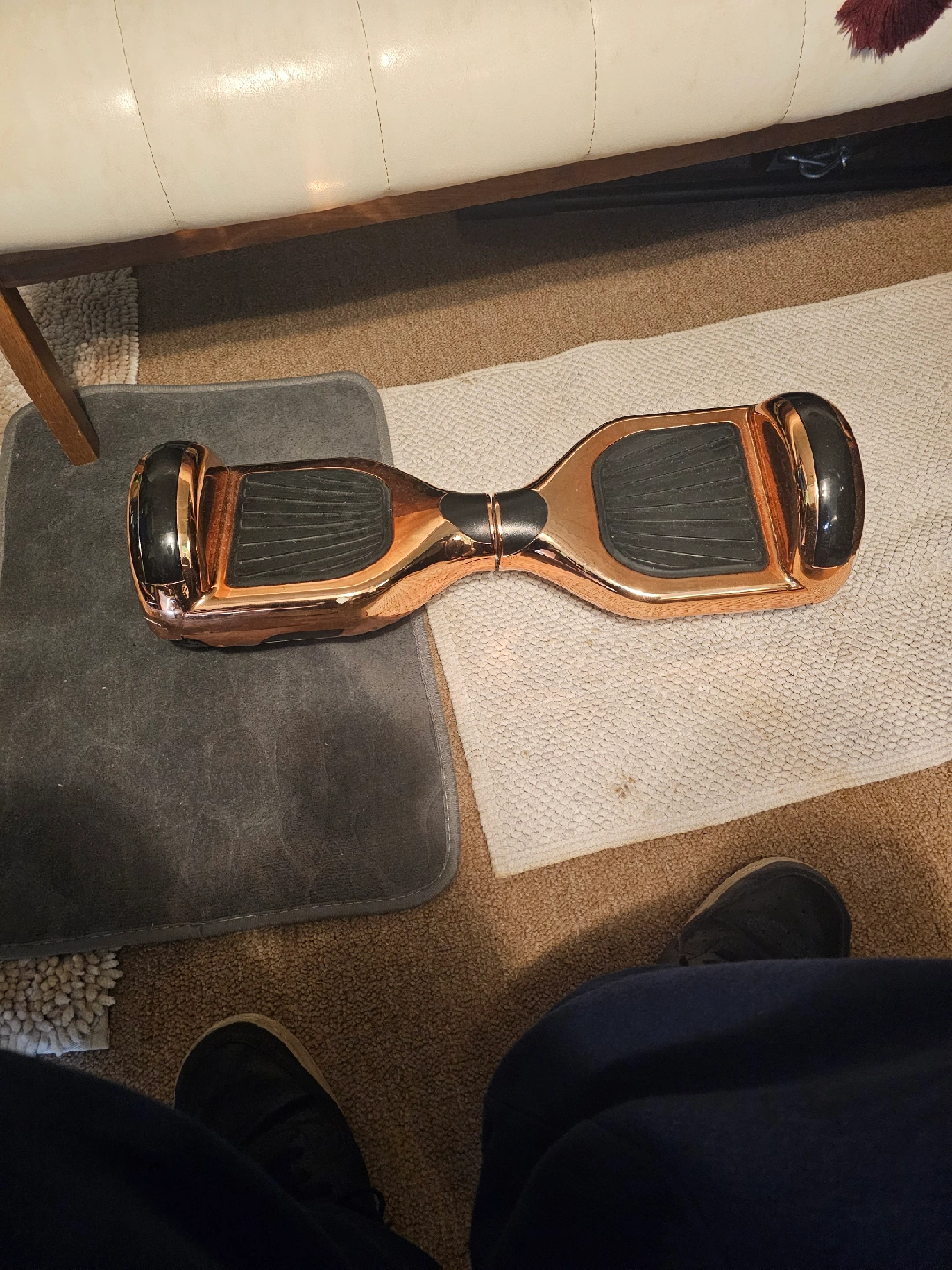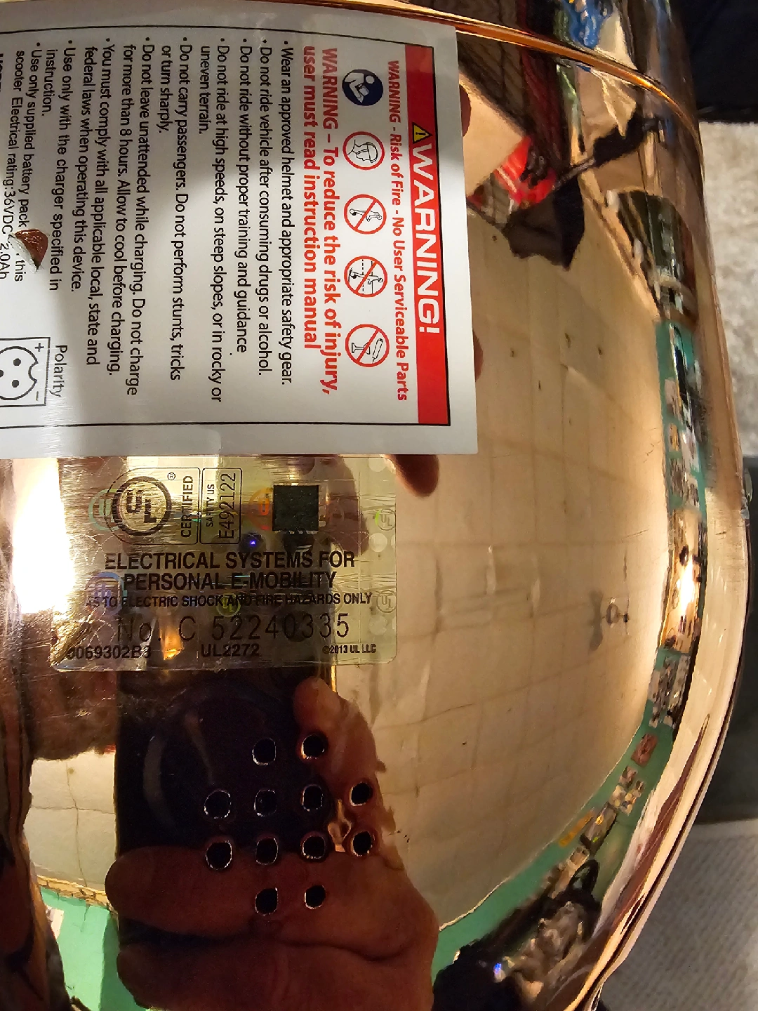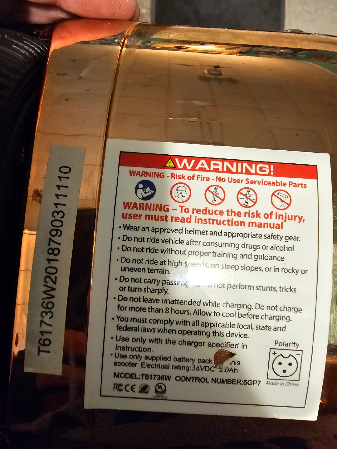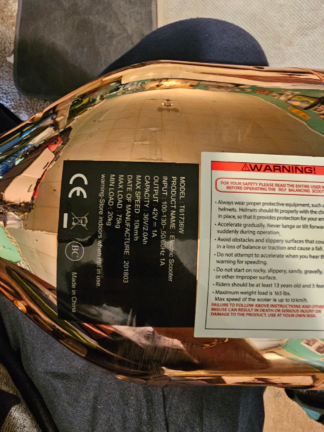 Selling a T61736W electric scooter in a unique copper color! It has a max speed of 10 km/h and a max load of 75kg. The date of manufacture is 2018 March 03. Please read the user manual before operating the self-balancing scooter and always wear proper protective equipment. no power.