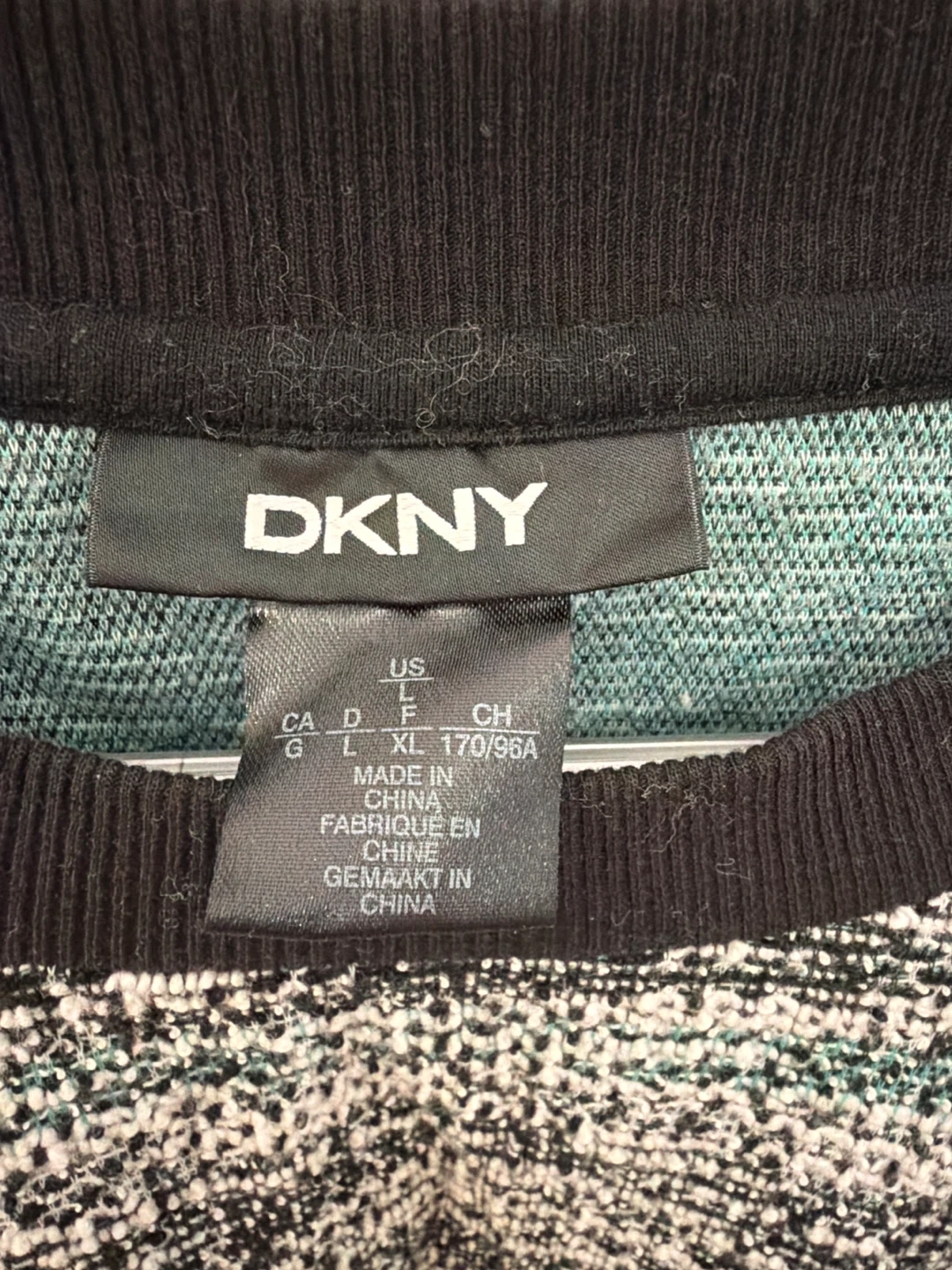 171This DKNY sweater is a stylish addition to any wardrobe! It features a unique knit pattern in black and white with hints of green.