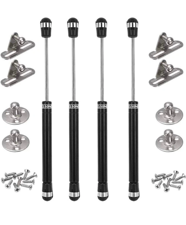 Gas Spring, 4PCS Gas Strut, BESTZY Gas Shocks, Soft Close Hinges, Toy Box Hinges, Lift Supports, Lid Support, Kitchen Cabinet Hinges Hydraulic Door Cabinet Hinge Spring (150N) Brand new, in the original package. Strong and high quality for the purpose. Specifications: Material: Metal Color: Matt black Total Length: Approx. 27cm / 10inch Load-bearing: 150N / 33ib/15KG Package Included: 4 * Hydraulic support rod 8 * flat base 20 * screws fixing For easy opening of kitchen cabinet doors. For lift up opening cabinet door panels High Quality material, durable and practical. Advance configuration, good usability. The nice accessories for tilt-up door. Rotatable and easy to adjust Very suitable for Kitchen Door, cabinet door, office equipment, aircraft, motor door or bus luggage. Feel free to message if you have any questions!