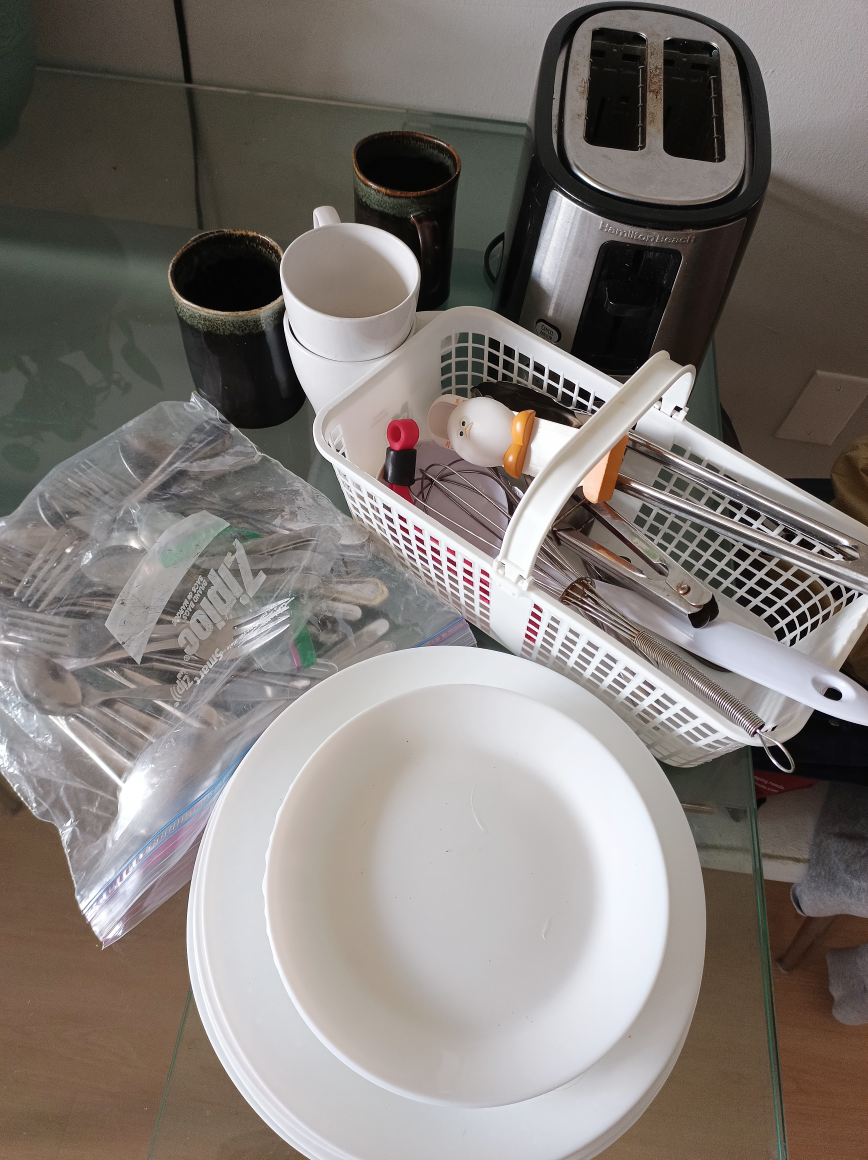 Selling a kitchenware set that includes plates, a Hamilton Beach toaster, utensils, and some mugs..