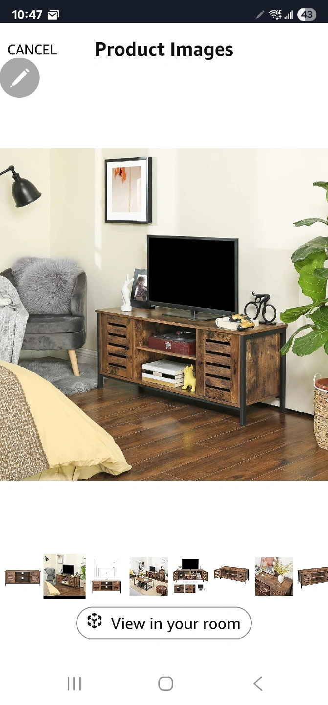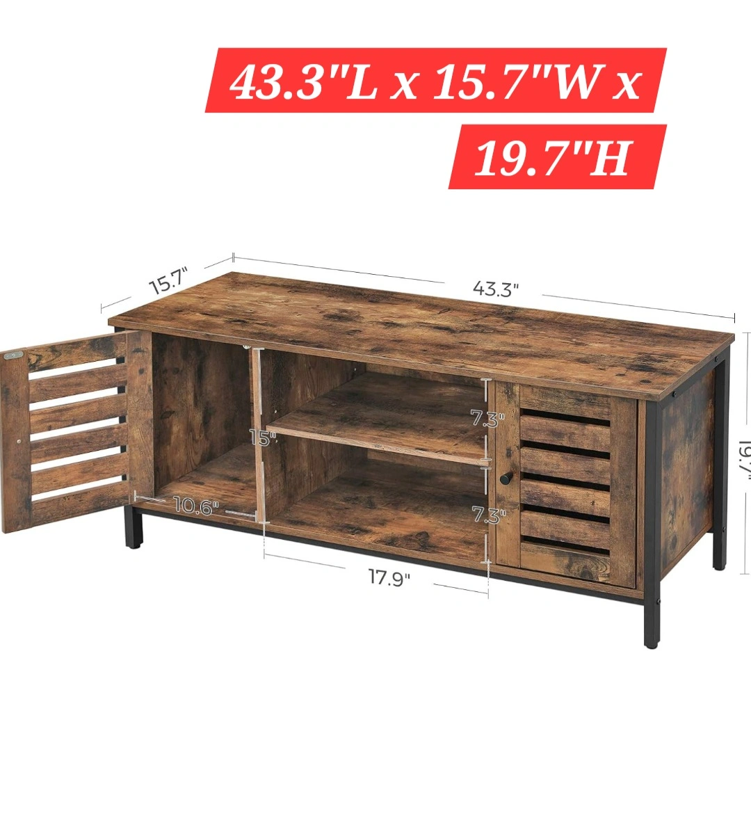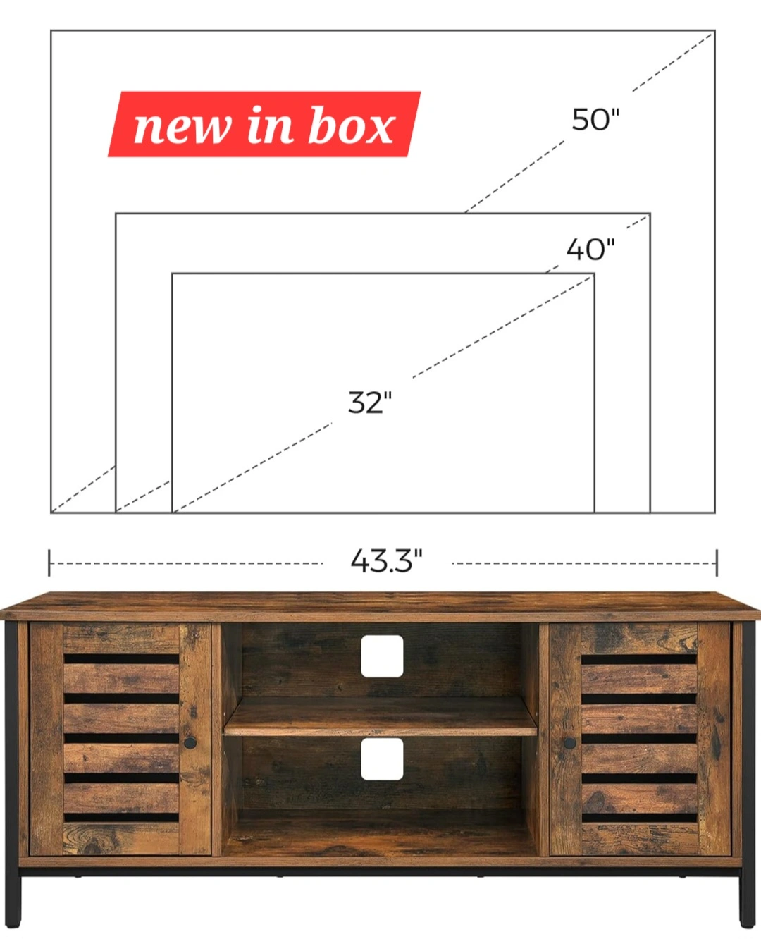 65This rustic brown TV stand is new in box and ready for a new home! It's perfect for TVs up to 50 inches. The dimensions are 43.3" L x 15.7" W x 19.7" H. It also features a 3-height adjustable shelf, so you can customize the storage to your needs