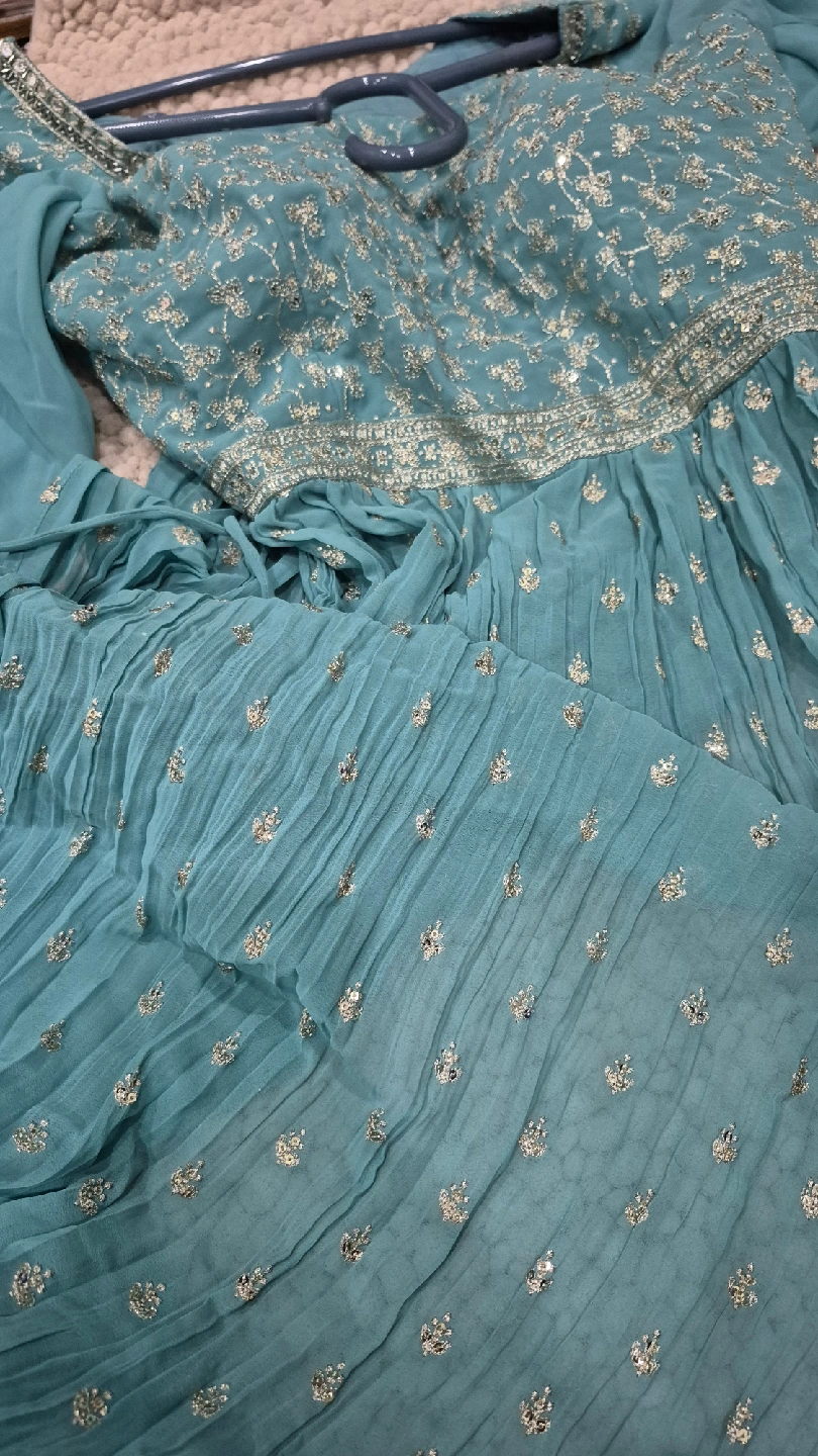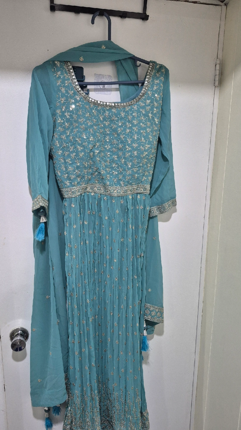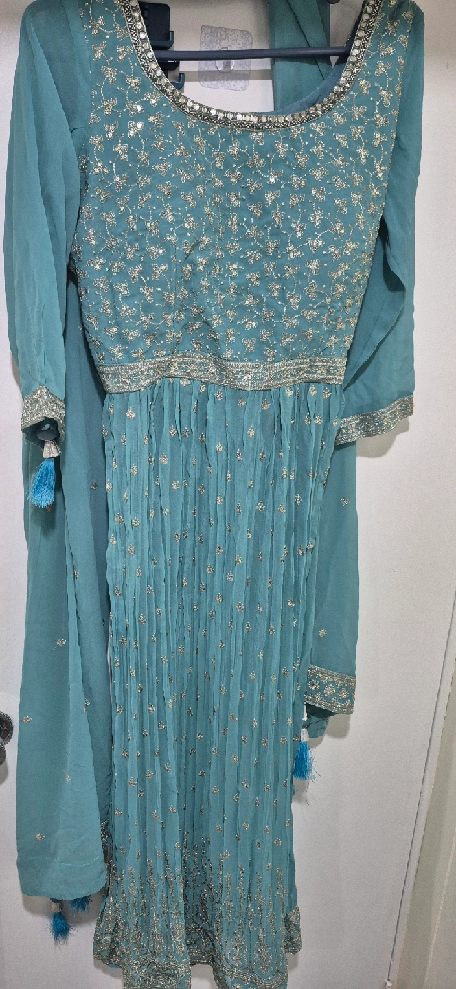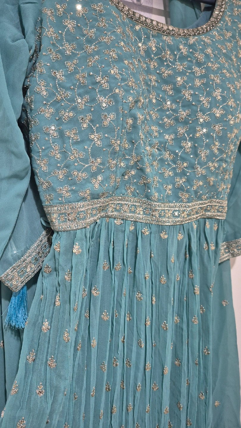18Selling a beautiful teal Anarkali dress with silver embellishments! It comes with a matching dupatta. The dress features long sleeves and a flowing skirt. Perfect for special occasions!