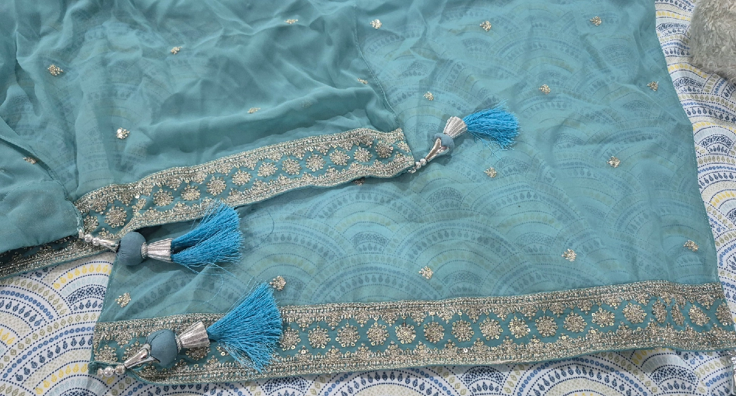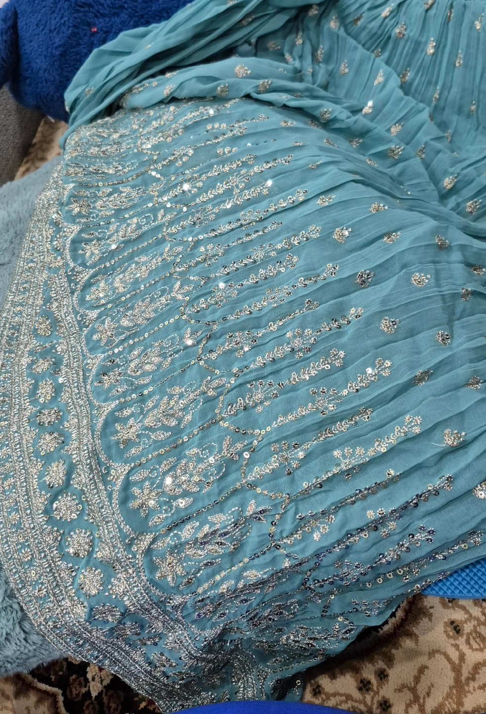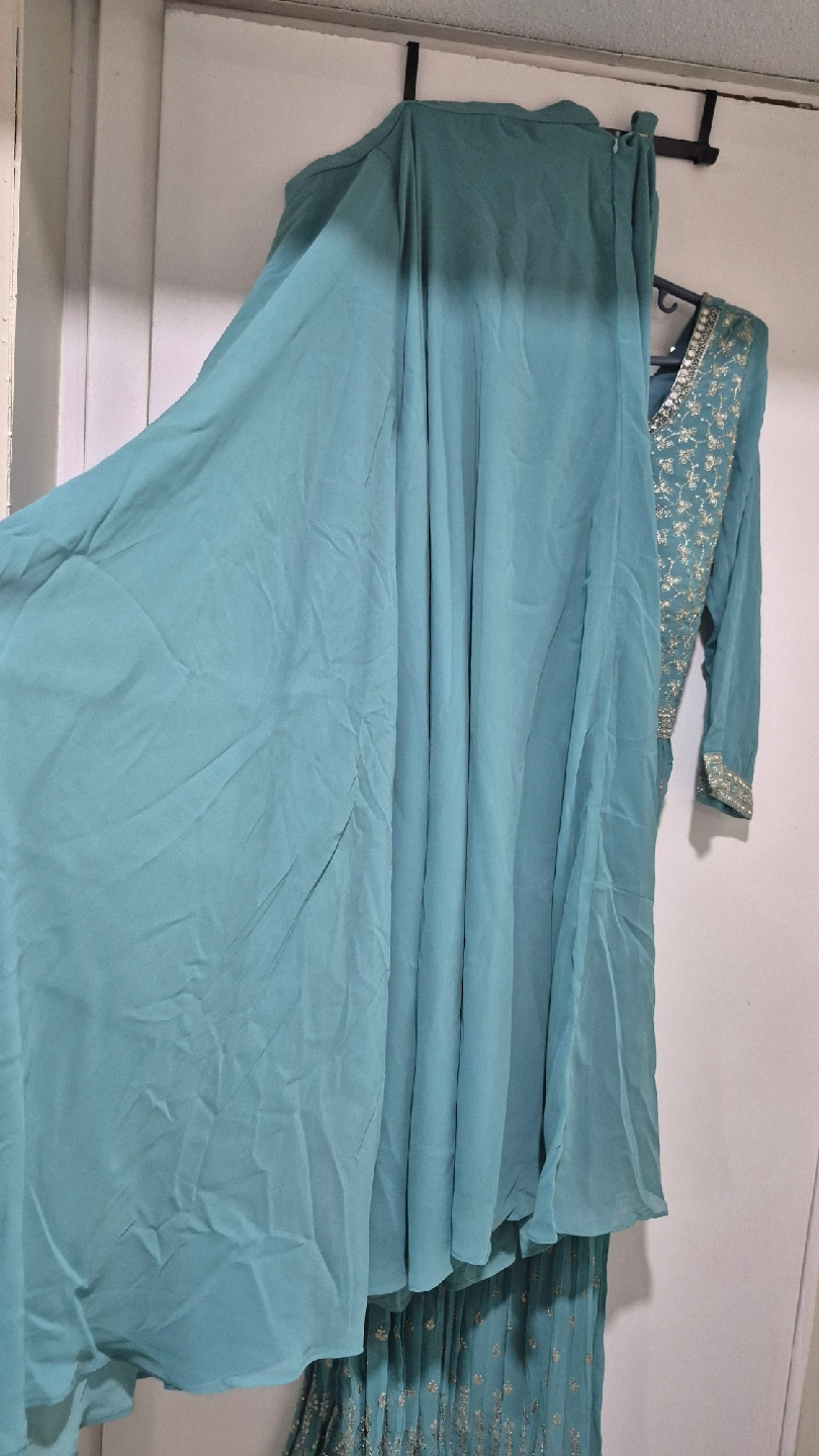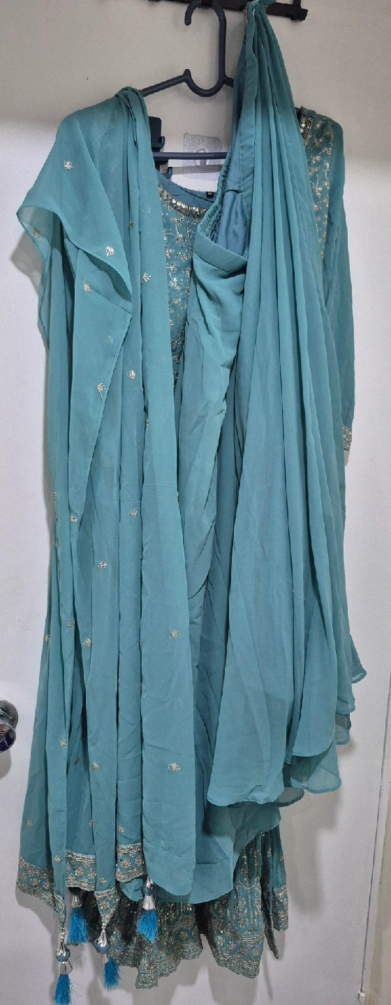 18Selling a beautiful teal Anarkali dress with silver embellishments! It comes with a matching dupatta. The dress features long sleeves and a flowing skirt. Perfect for special occasions!