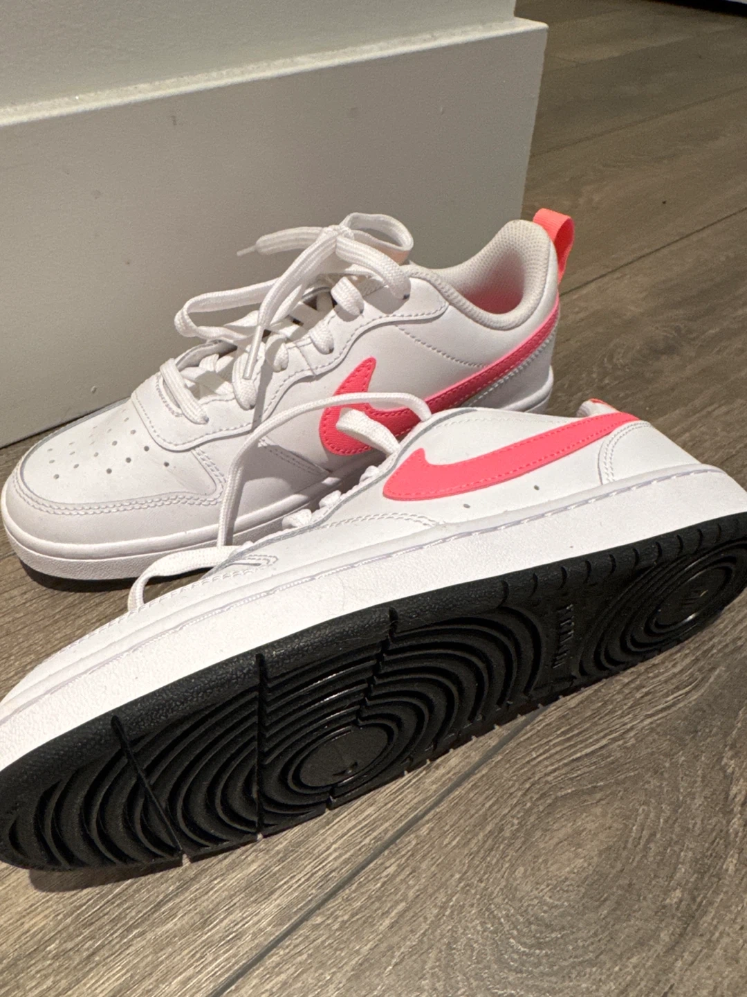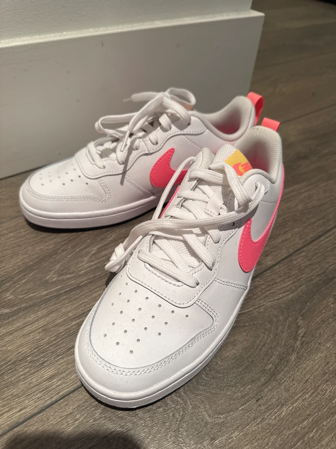 71These Nike Court Borough Low 2 sneakers are in great shape! They feature a stylish white and pink colourway, perfect for adding a pop of colour to your everyday look. The iconic Nike swoosh is prominently displayed, and the low-profile design makes them super versatile. These shoes are comfy and ready for a new home