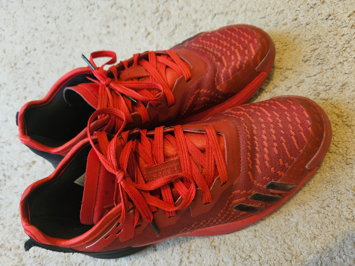 143Selling a pair of Adidas D.O.N. Issue #4 basketball shoes in red. They're in good condition and ready for the court! The shoes feature the 'Mitchell' branding on the heel.