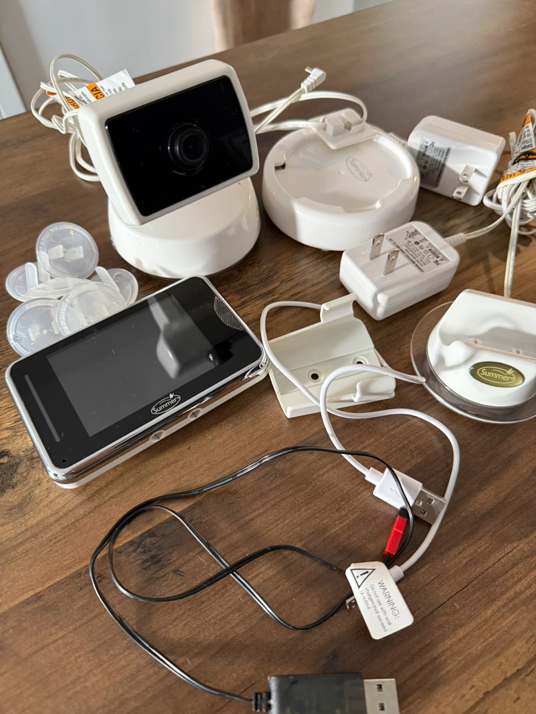 Selling a Summer Infant baby monitor. It comes with all the components you see in the pictures, including the camera, monitor, and various accessories and chargers. Great for keeping an eye on your little one!