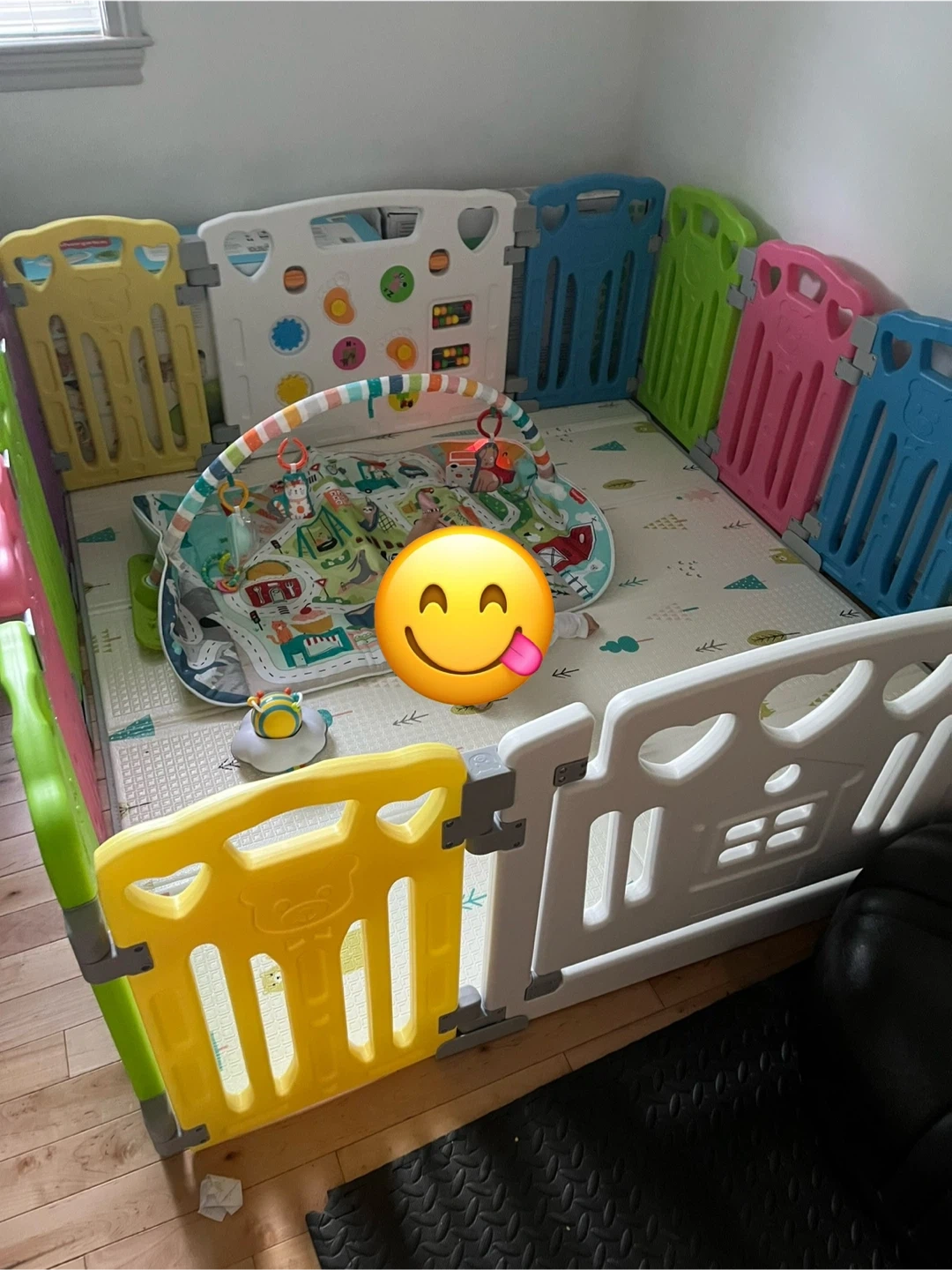 107Selling a baby playpen with a colourful activity mat. The playpen has panels in various colours, including yellow, white, blue, green, and pink. It's in good condition and ready for a new home!
