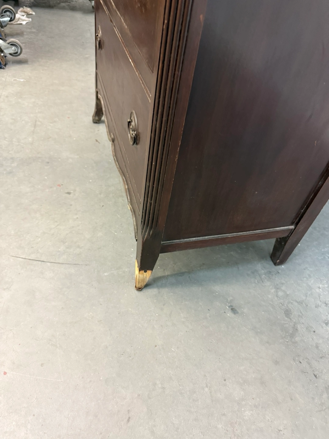 Here's an antique wooden chest of drawers. It features a classic design with multiple drawers for storage. There are some signs of wear and tear, including scratches on the top and a damaged foot, but it still has a lot of charm and character