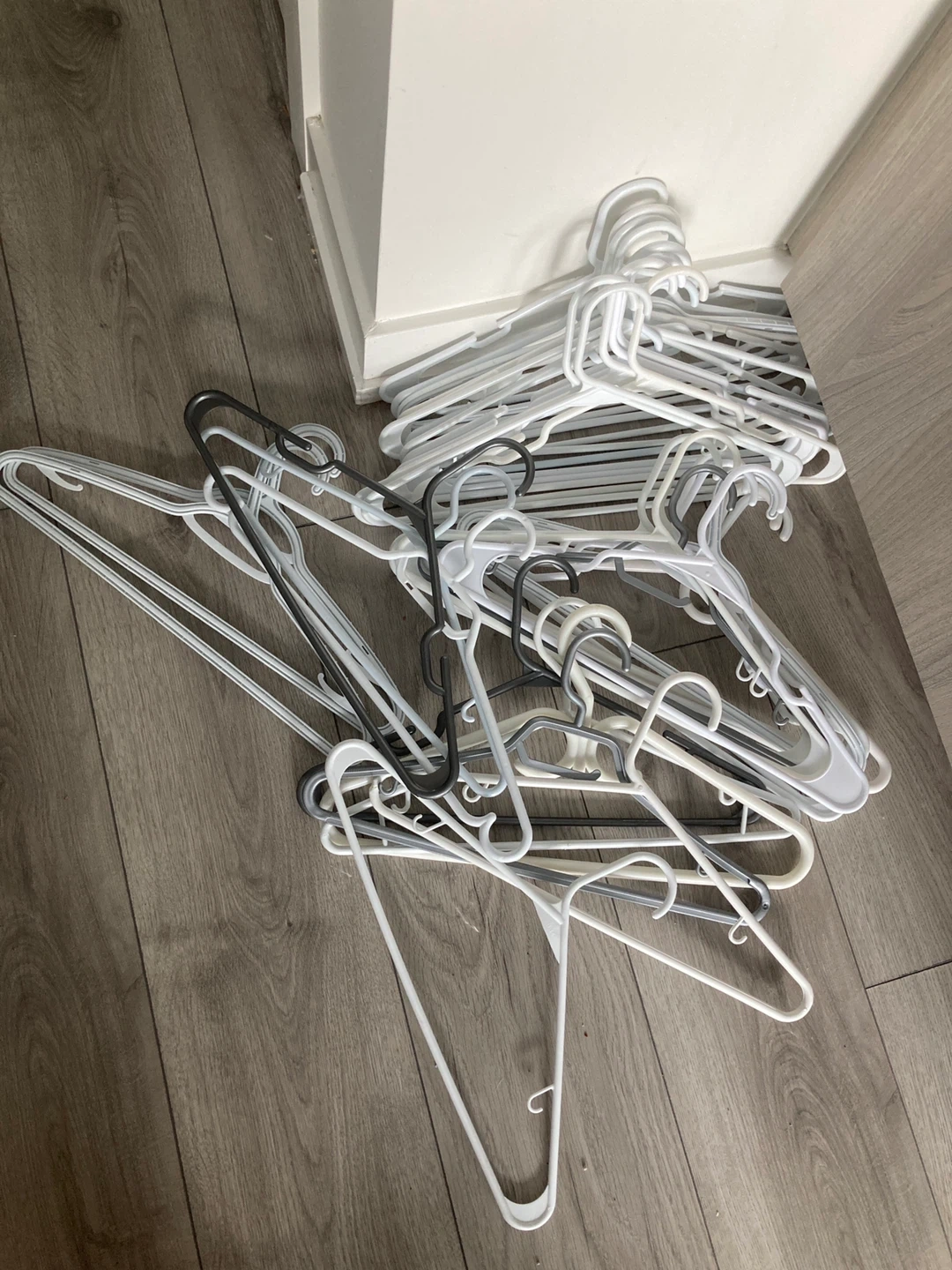 186Selling a bunch of plastic clothes hangers! There are some in white and some in grey. Perfect for organizing your closet or setting up a new wardrobe