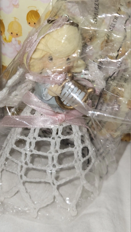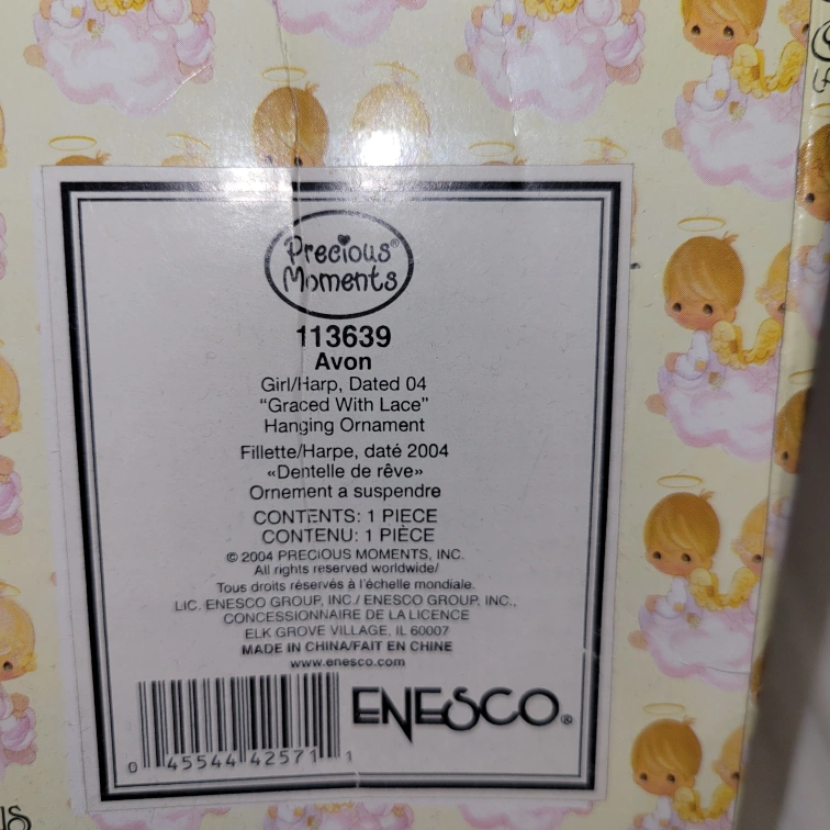 Selling a Precious Moments Avon Girl/Harp, dated 04 “Graced With Lace” Hanging Ornament. It's still in its original packaging!