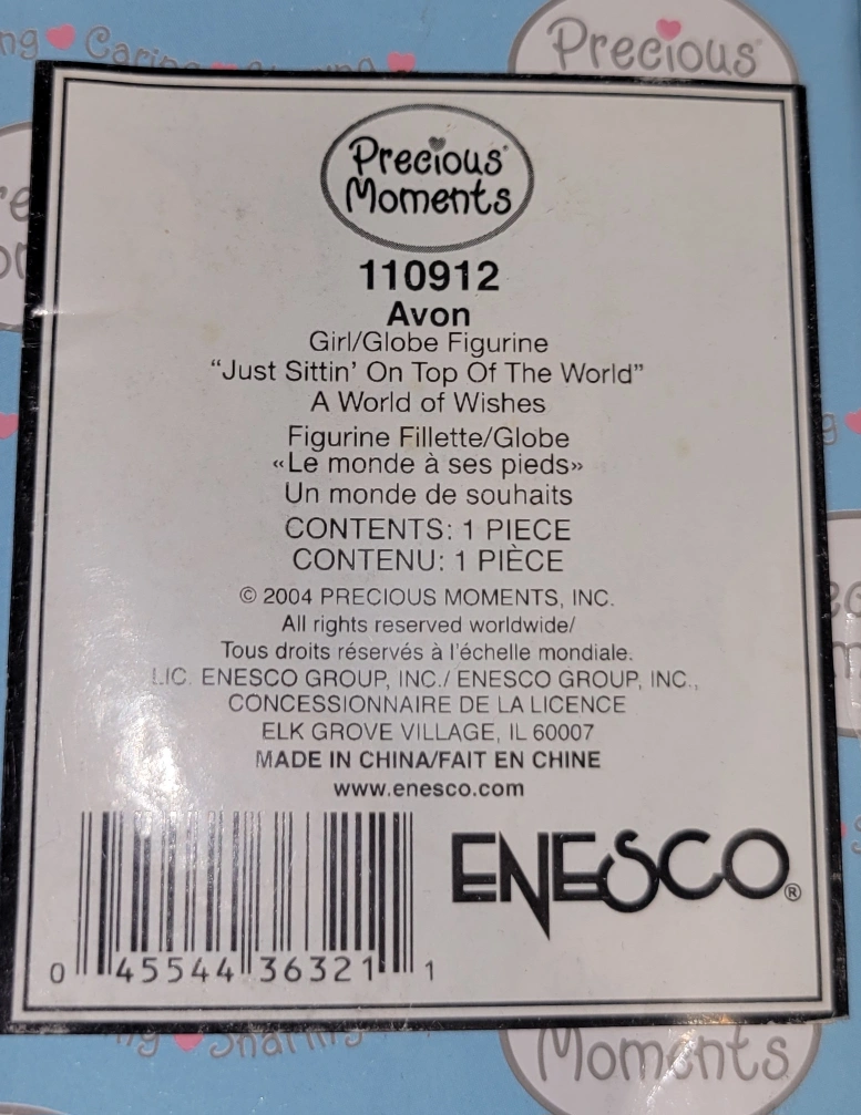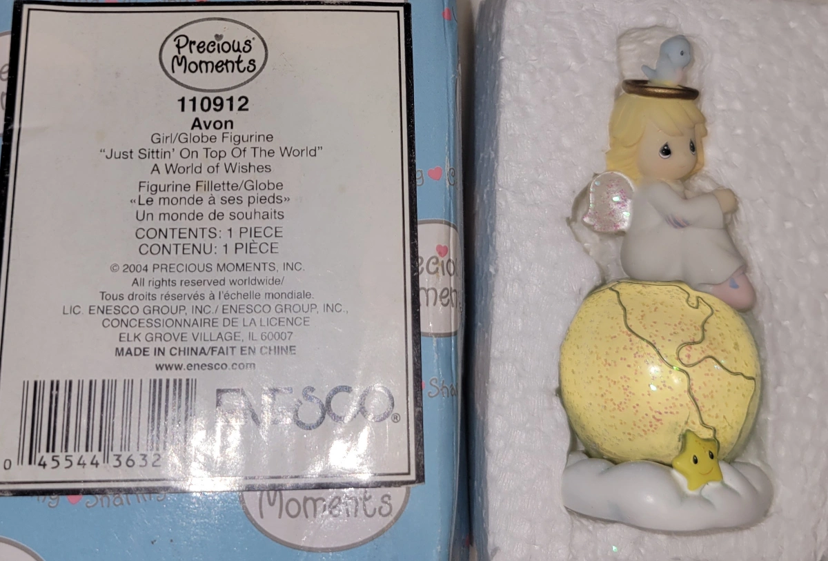 30Selling a Precious Moments figurine, model number 110912 Avon. It's a girl/globe figurine titled "Just Sittin' On Top Of The World". New still in original box.