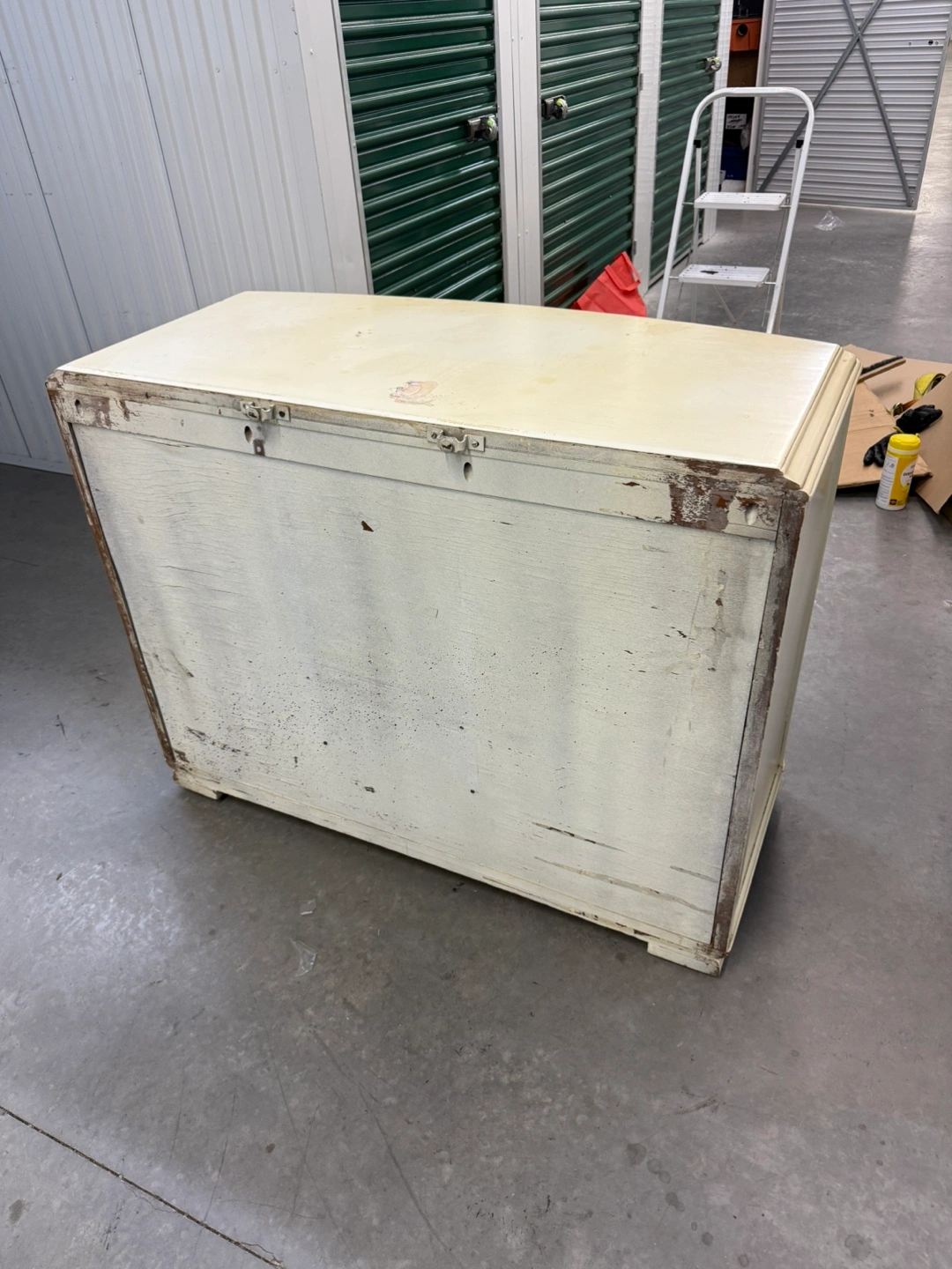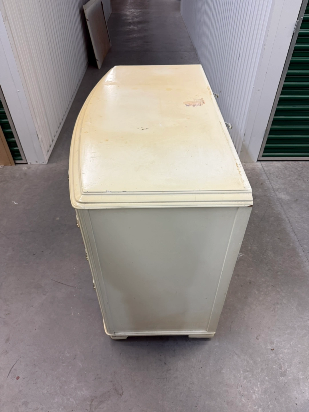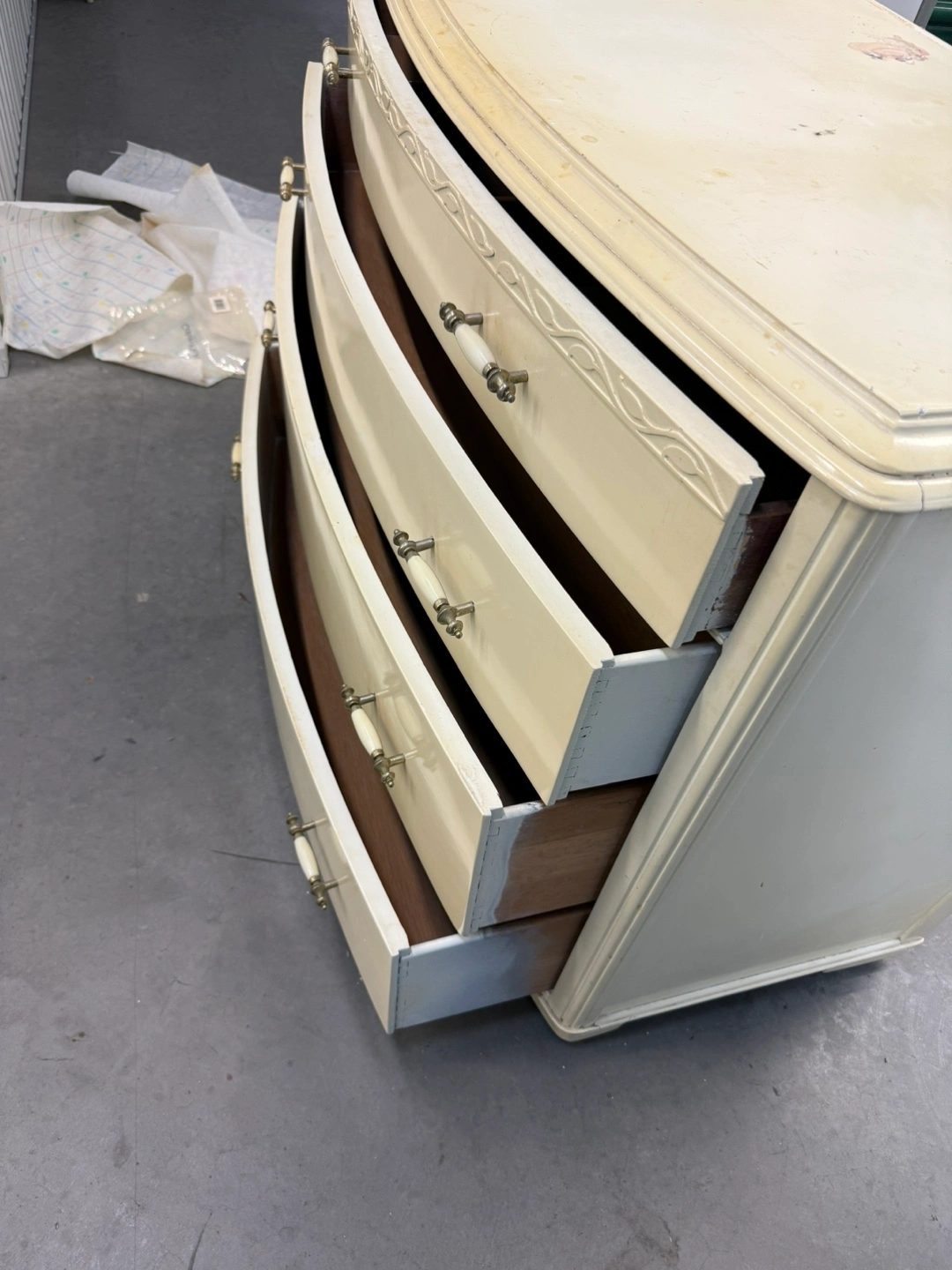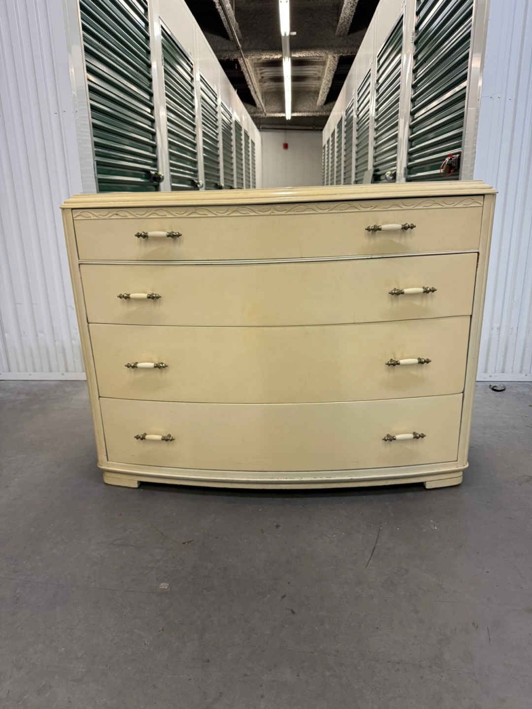 Here's a vintage dresser with four drawers. It has a unique, curved design and decorative handles. There are some signs of wear and tear, but it's still a solid piece of furniture with lots of character