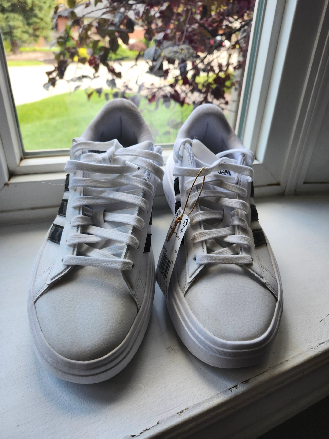 10Selling a pair of Adidas Grand Court sneakers in white! These are in great condition and ready for a new home. Perfect for everyday wear! They are too big for me, so they have never been worn. plus they are also wide fit