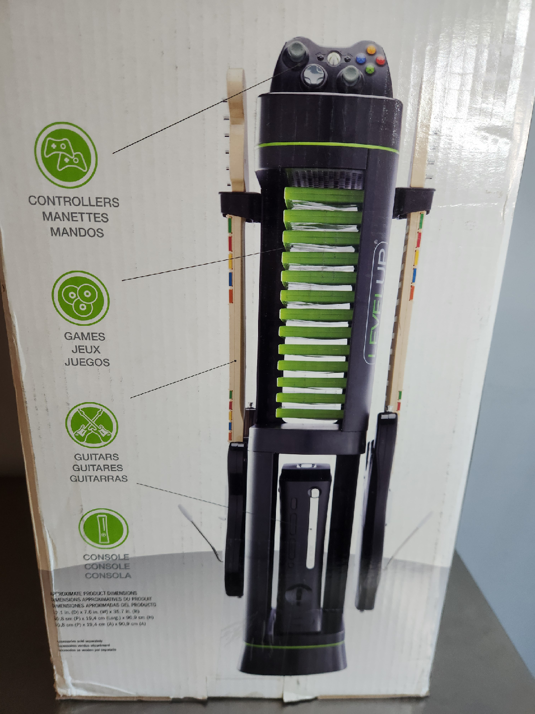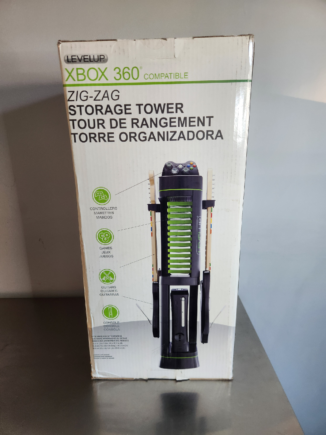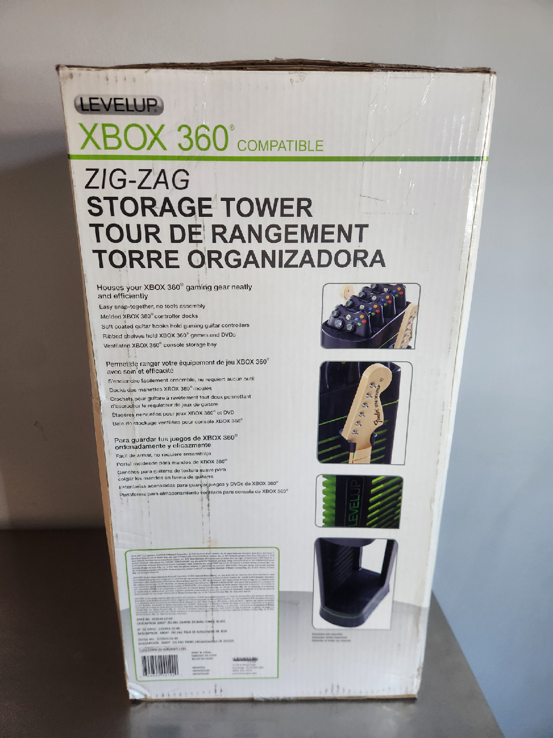Selling a Level Up Xbox 360 compatible Zig-Zag storage tower. It's perfect for keeping your gaming gear neatly organized. It houses your Xbox 360 gaming gear efficiently, and is easy to assemble! It also has molded Xbox 360 controller docks and ventilated Xbox 360 console storage tray.