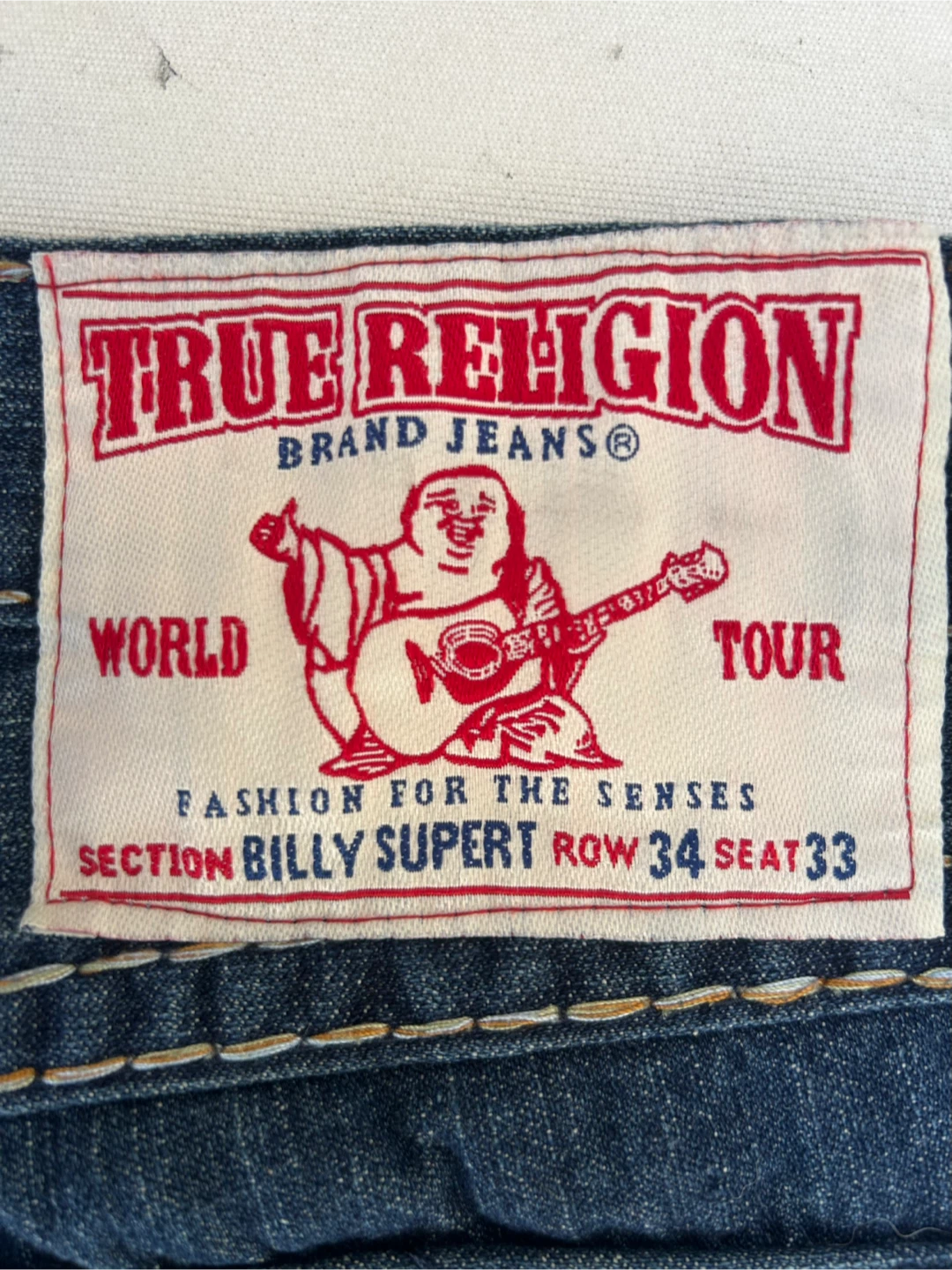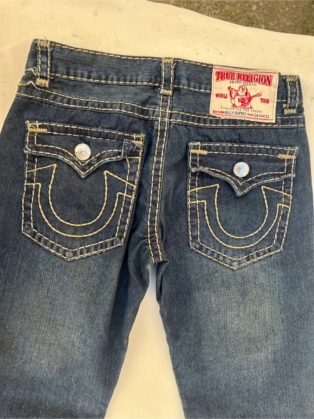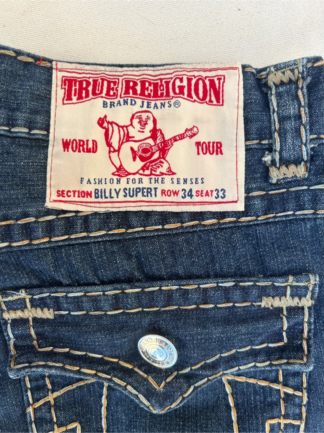 True Religion jeans in size 34. These jeans feature a classic denim wash and signature True Religion stitching. They are in good condition and ready for a new home!