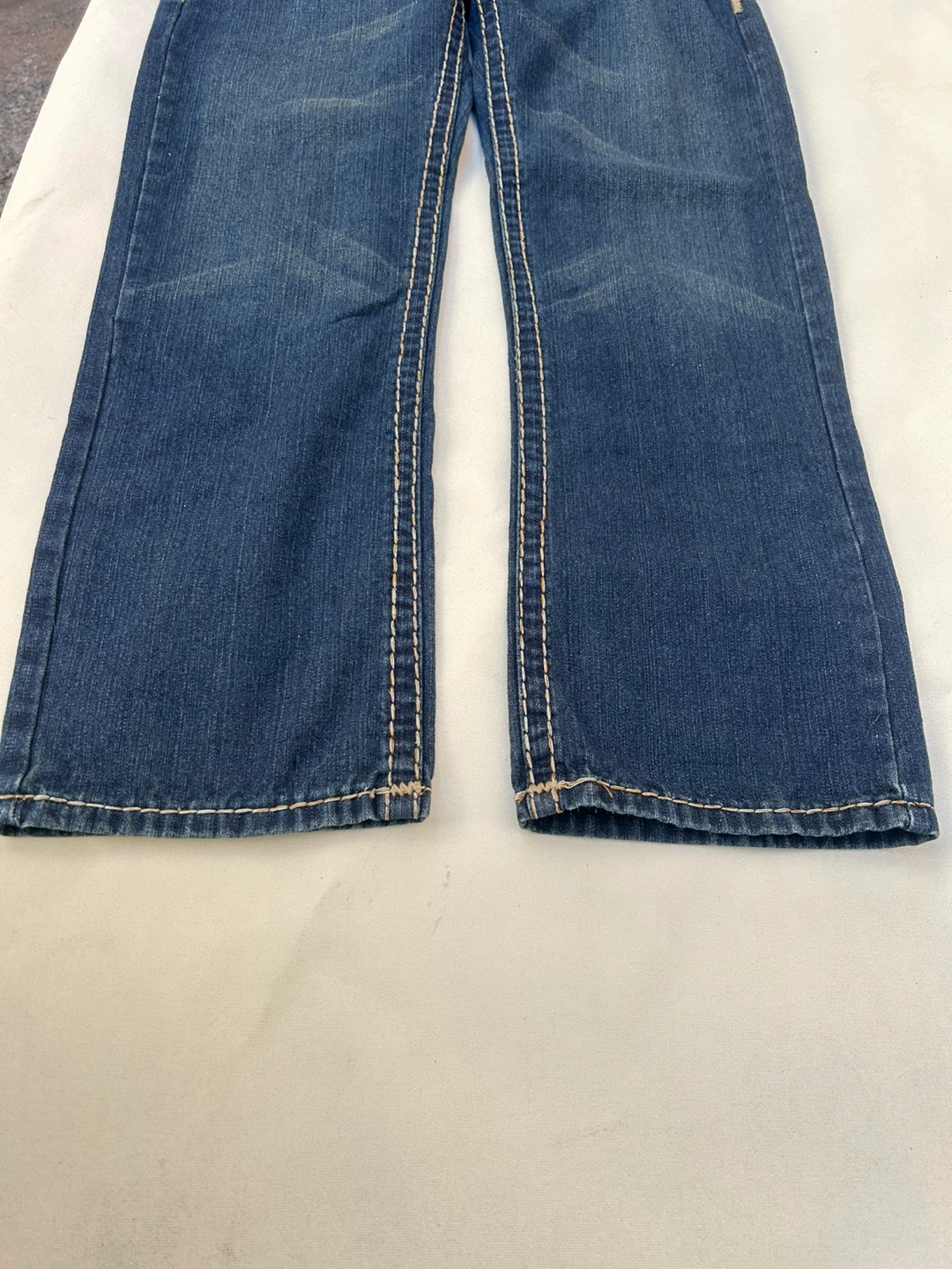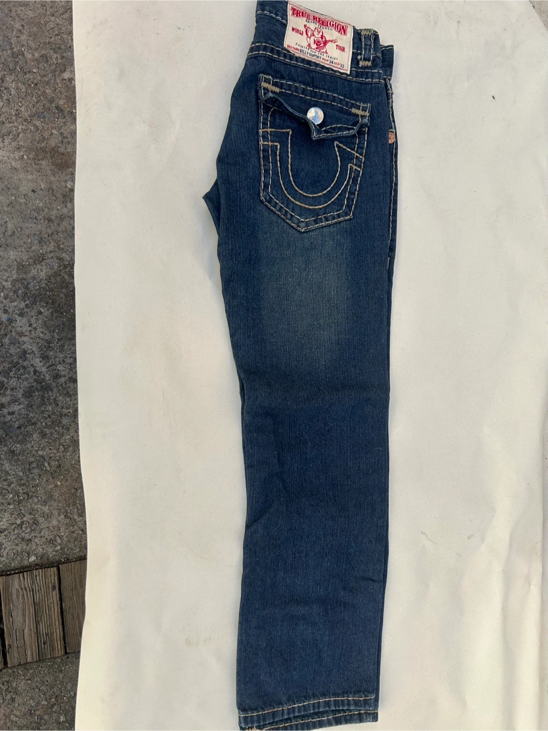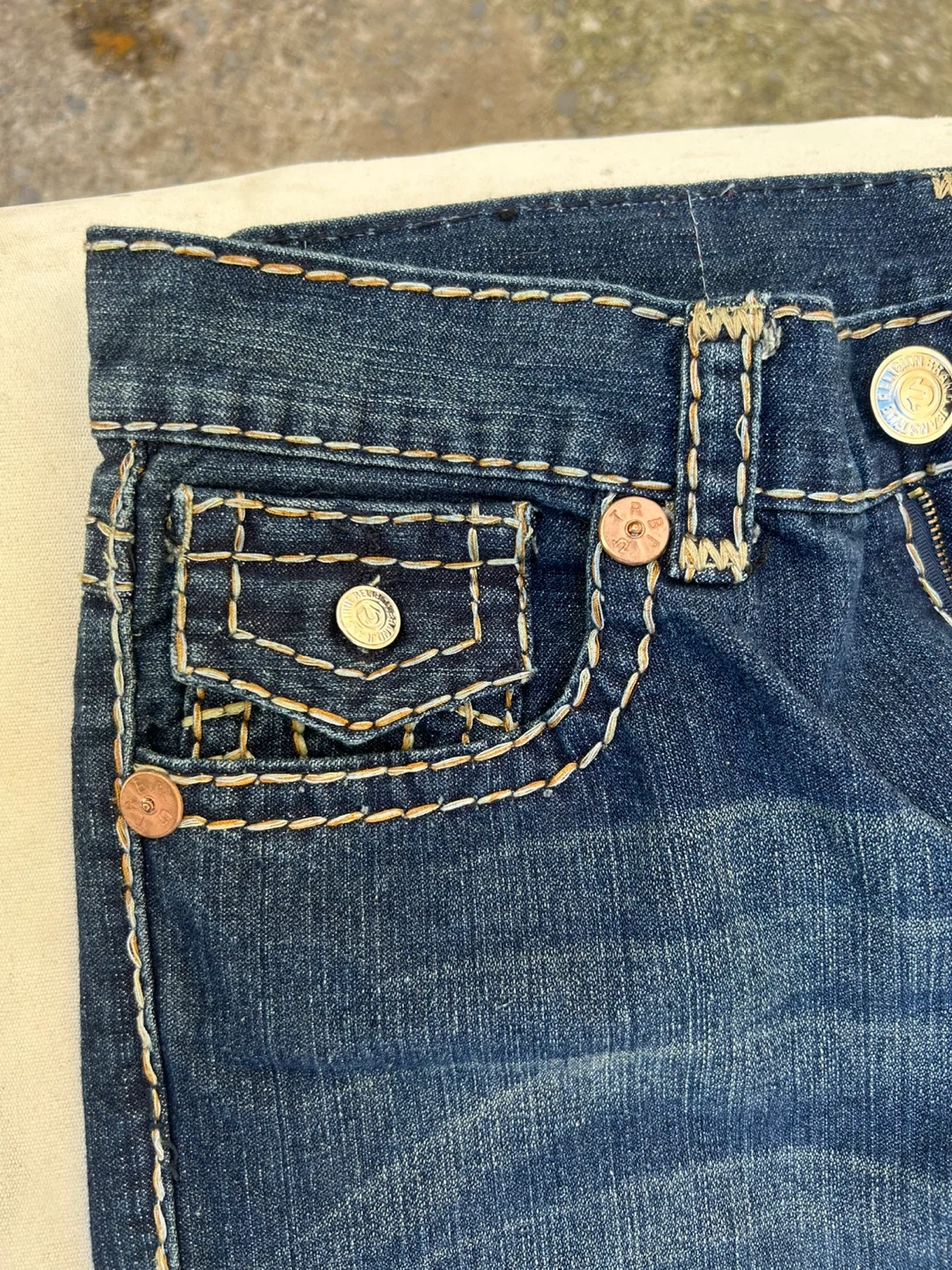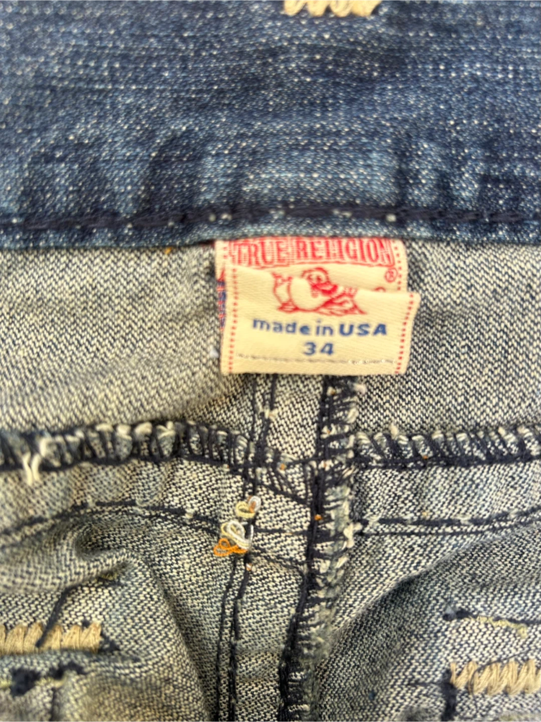 True Religion jeans in size 34. These jeans feature a classic denim wash and signature True Religion stitching. They are in good condition and ready for a new home!