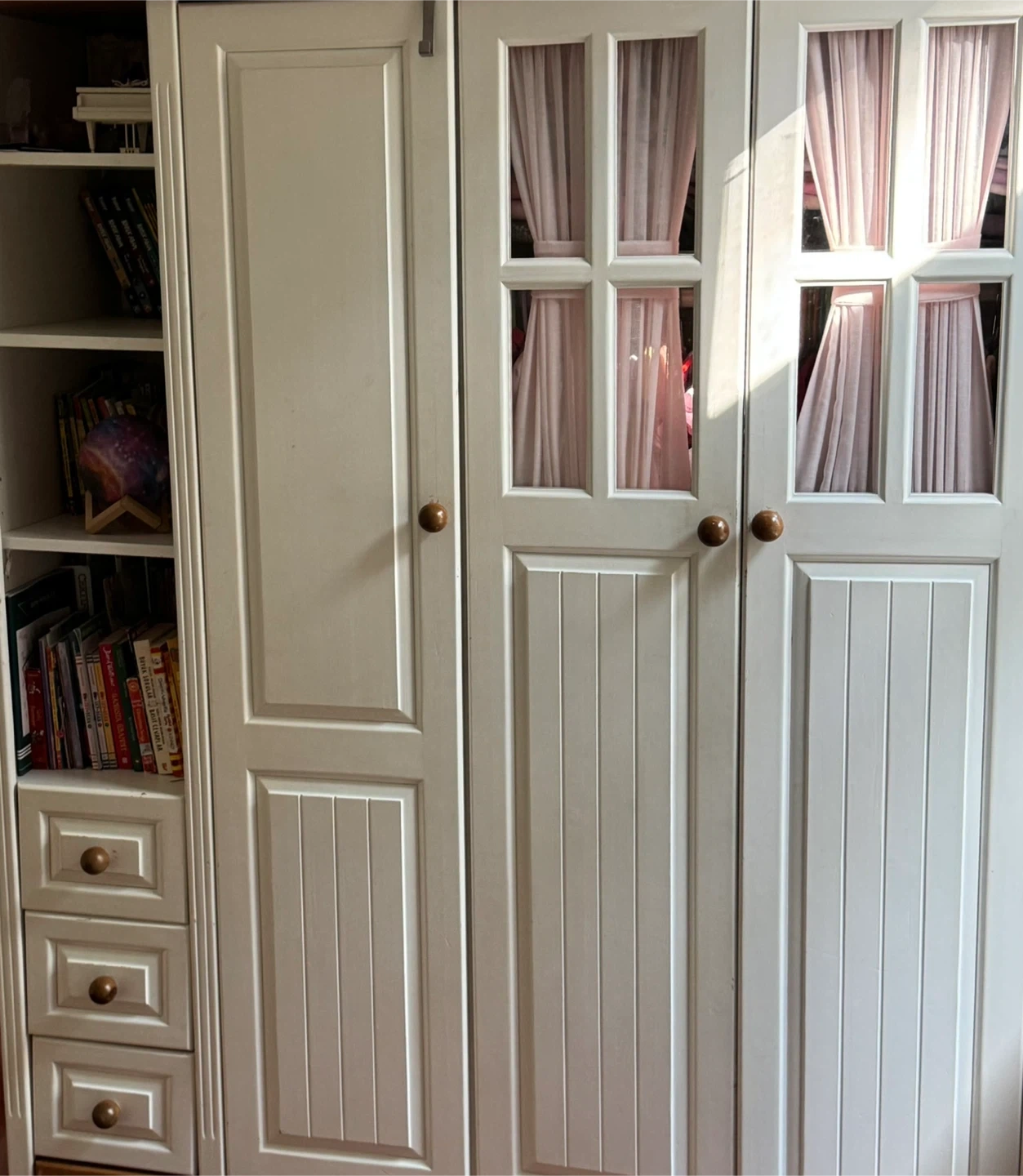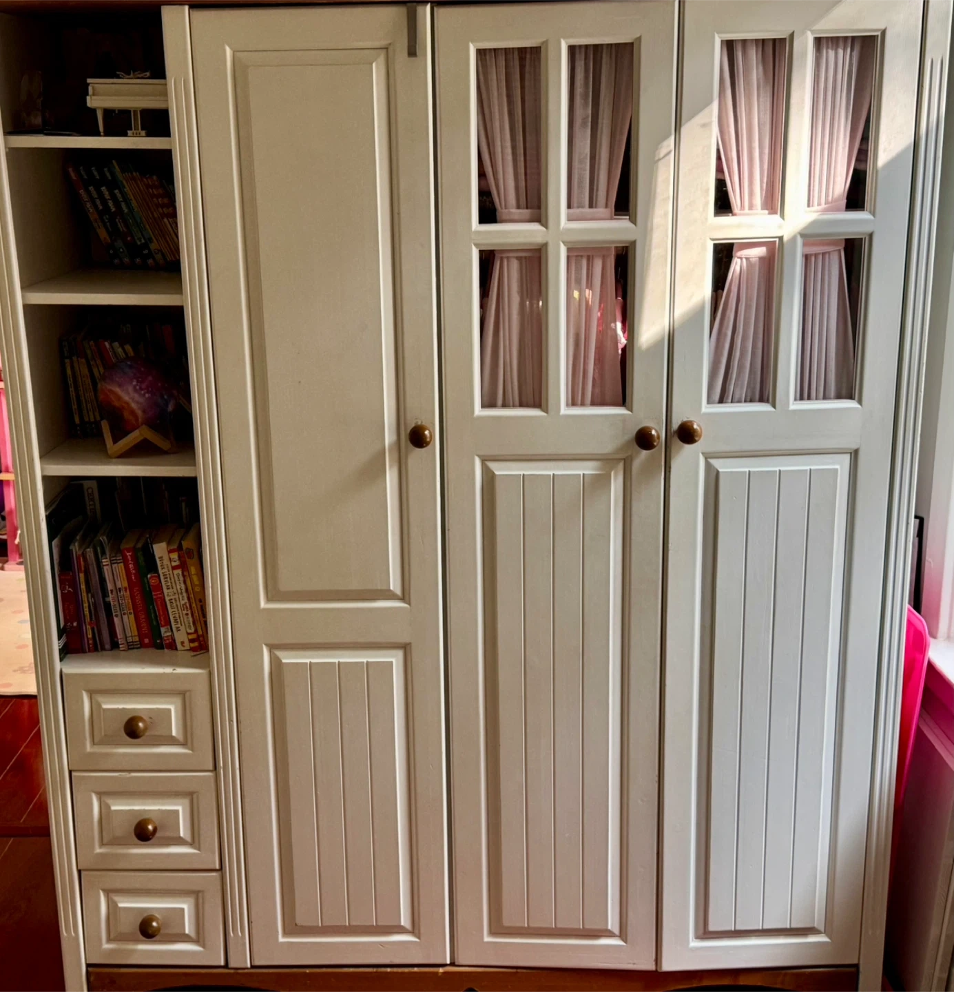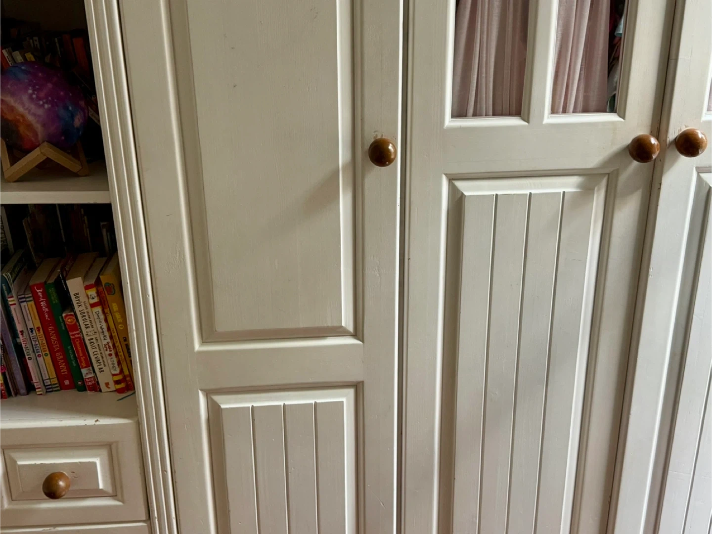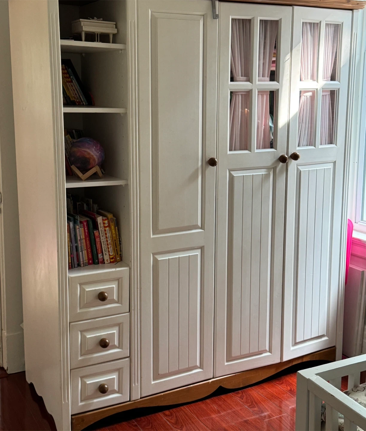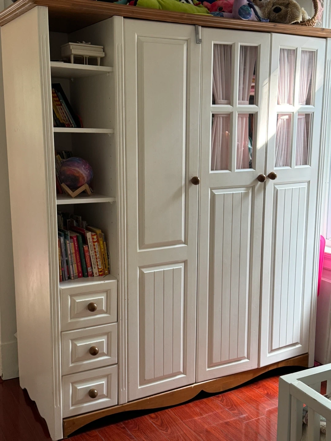 27Beautiful, high-quality solid wood wardrobe made with non-toxic, child-safe paint — no harmful chemicals or odours. Perfect for a nursery, kids’ room, or cozy bedroom. This piece combines timeless design with practicality: • 3 doors for hanging and shelving • 3 drawers + open side shelves for extra storage • Elegant light finish that fits any decor • Durable, sturdy build — designed to last • Excellent condition, gently used 📏 Dimensions: 186 cm (H) × 162 cm (W) x 60 cm (D) 💰 $560 (or best offer) 🚗 Pickup only (2 people are needed for disassembly and carrying.) This wardrobe adds warmth, quality, and peace of mind to your space — a perfect mix of style and safety. (Check my other listings)