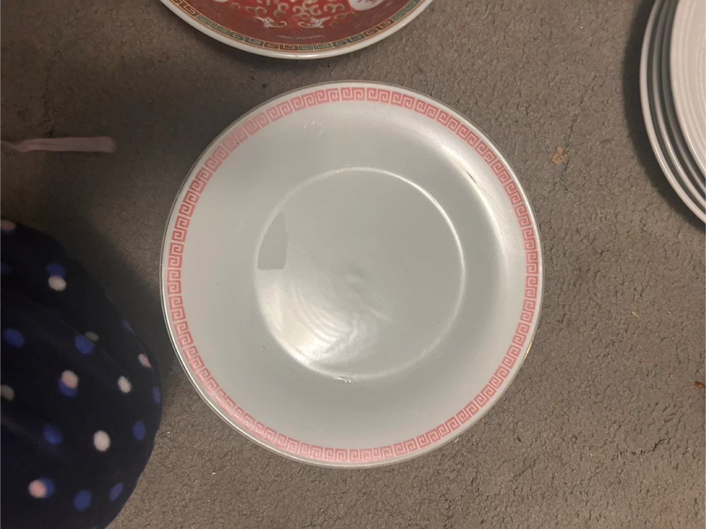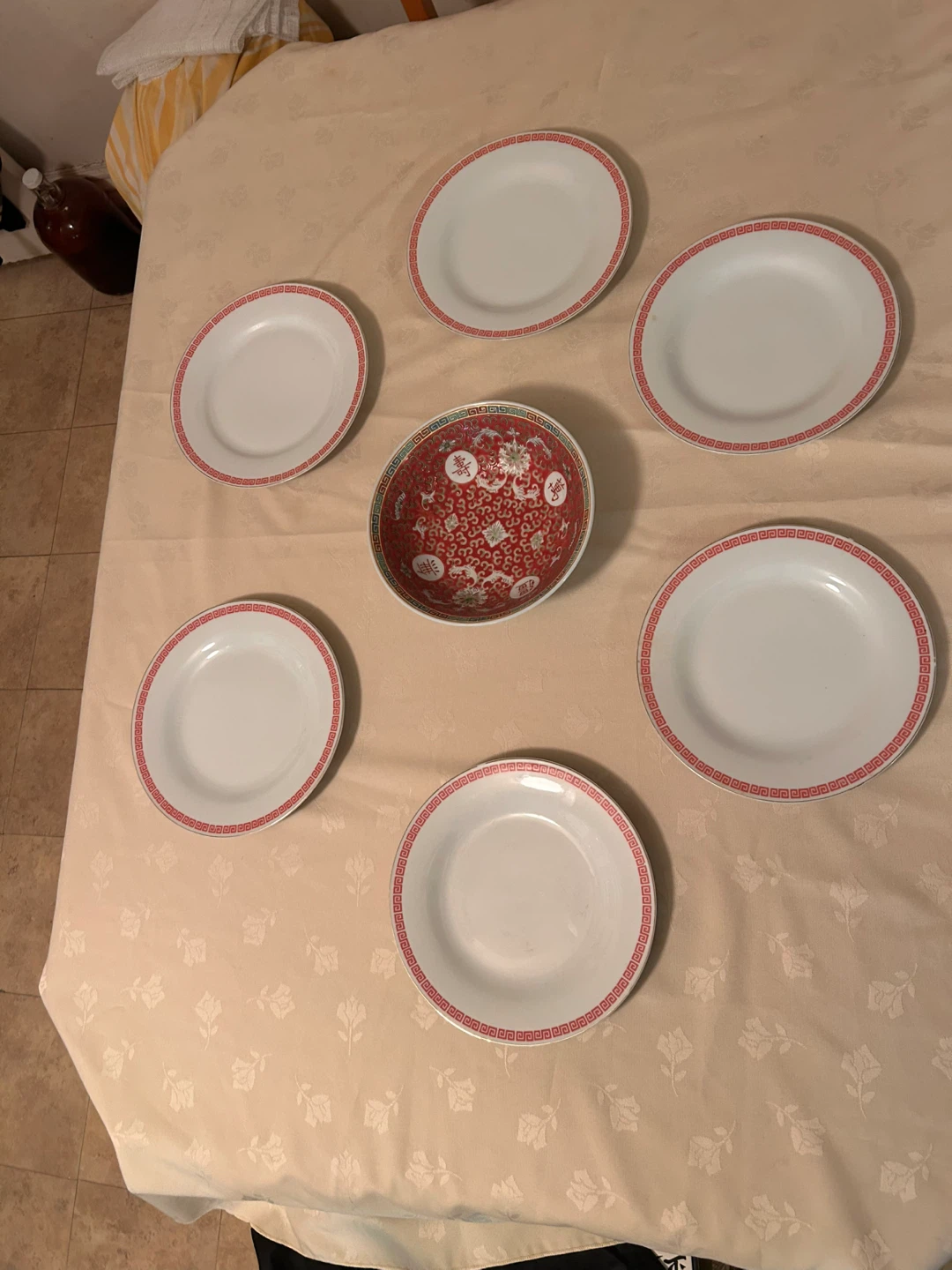 Selling a beautiful antique Famille Rose Mun Shou Longevity enameled porcelain serving bowl and 6 matching white with red enamel and gold plated rimmed dinner plates.