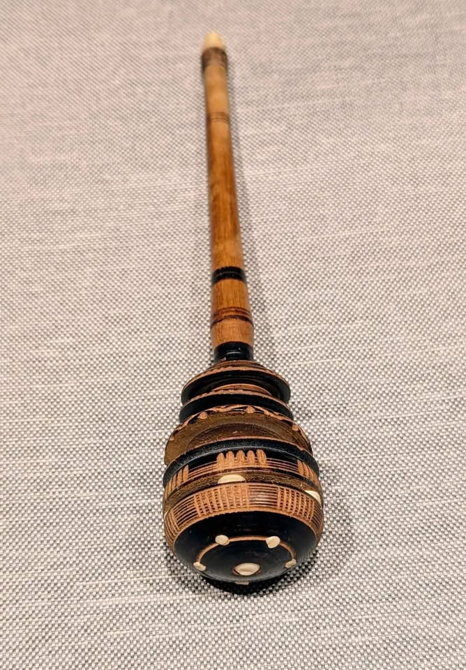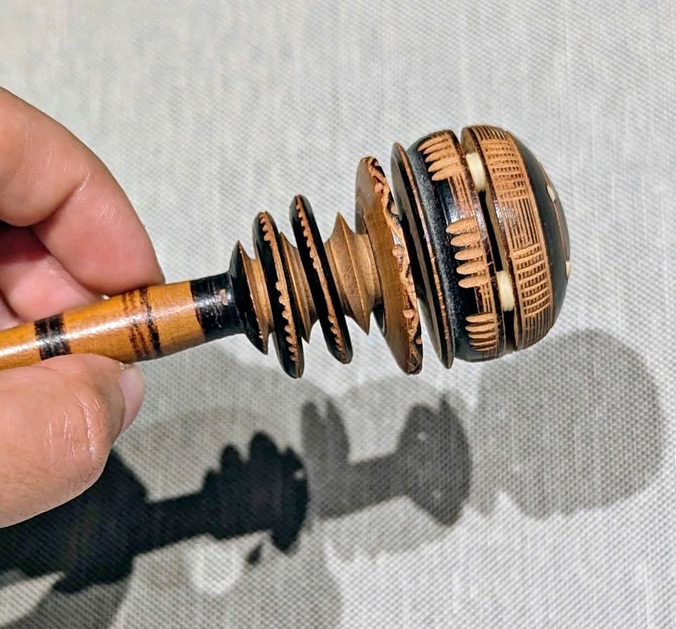 A beautifully carved molinillo, traditional Mexican wooden whisk used to froth and mix warm drinks like hot chocolate, atole, and champurrado.