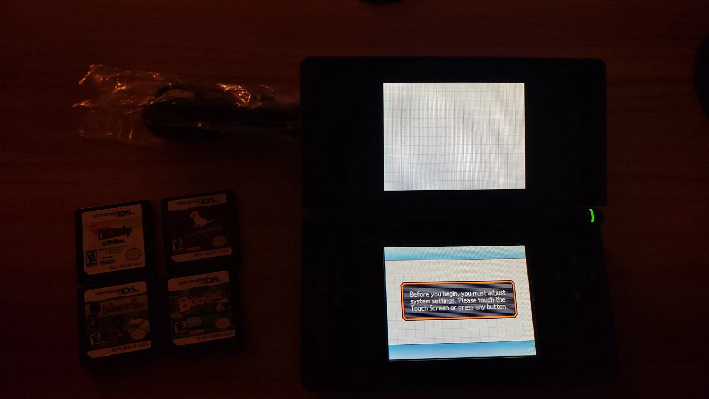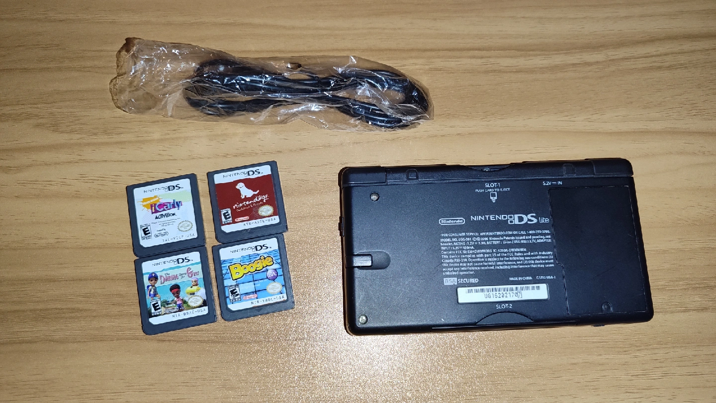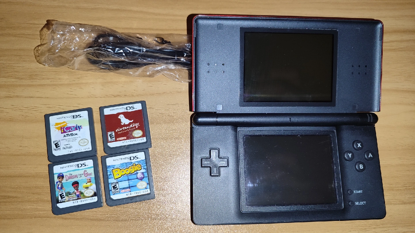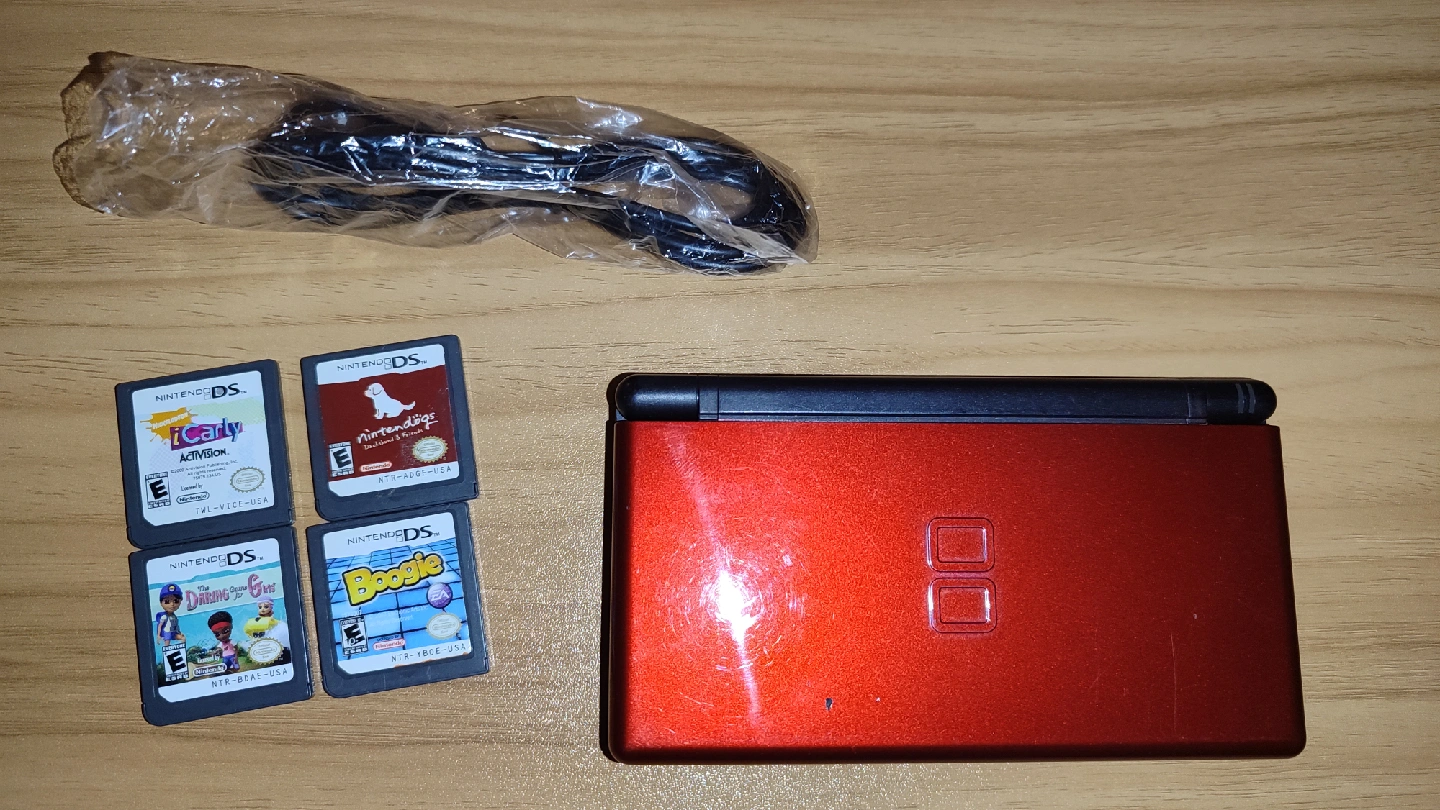 Selling a Nintendo DS Lite with four games and a charger. The games included are iCarly, Petz Dogz 2, Dairyland, and Boogie. It's in good condition and ready for a new home!