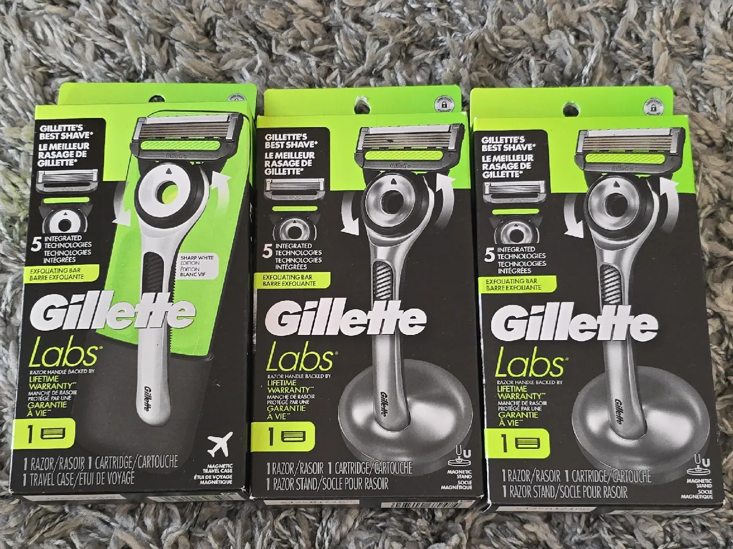 selling as a lot, 3 brand new Gillette Labs razor available! It comes with either a magnetic stand or a travel case, depending on the one you choose. Each razor includes 1 cartridge. The razor handle is backed by a lifetime warranty, so you know it's built to last! This razor features 5 integrated technologies and an exfoliating bar for the best shave