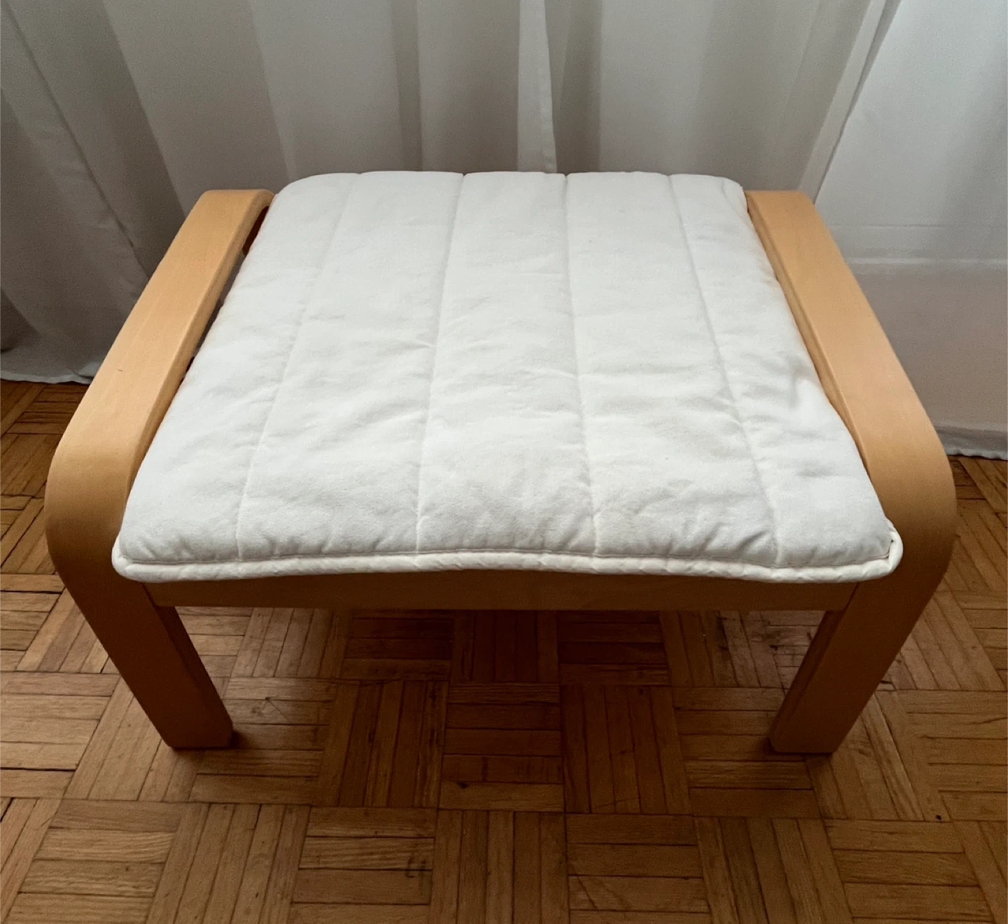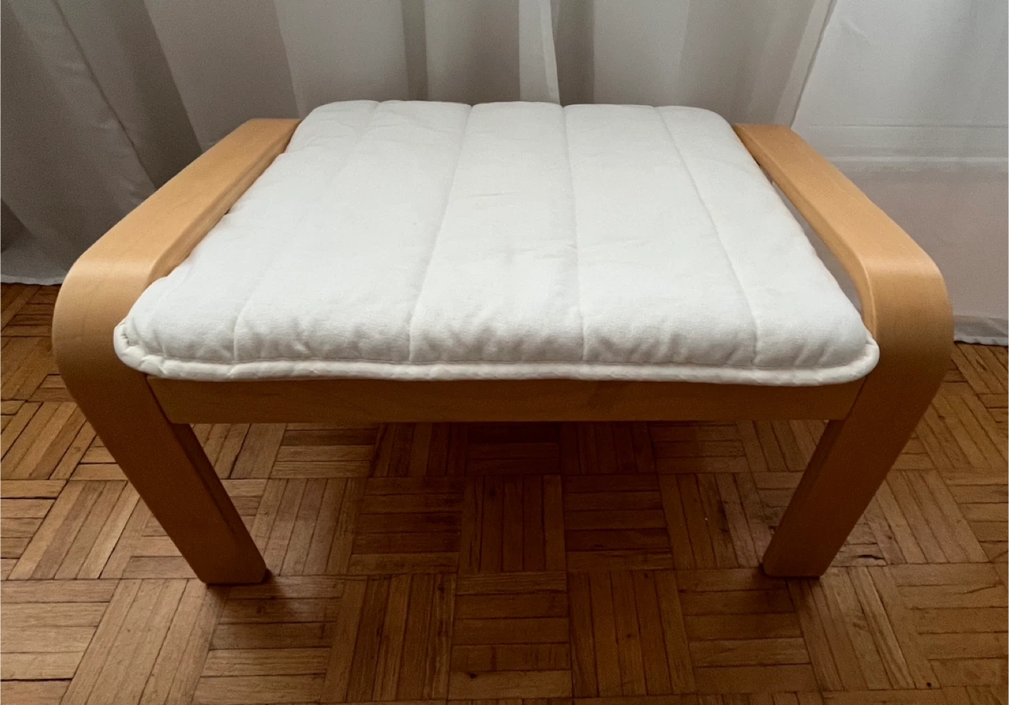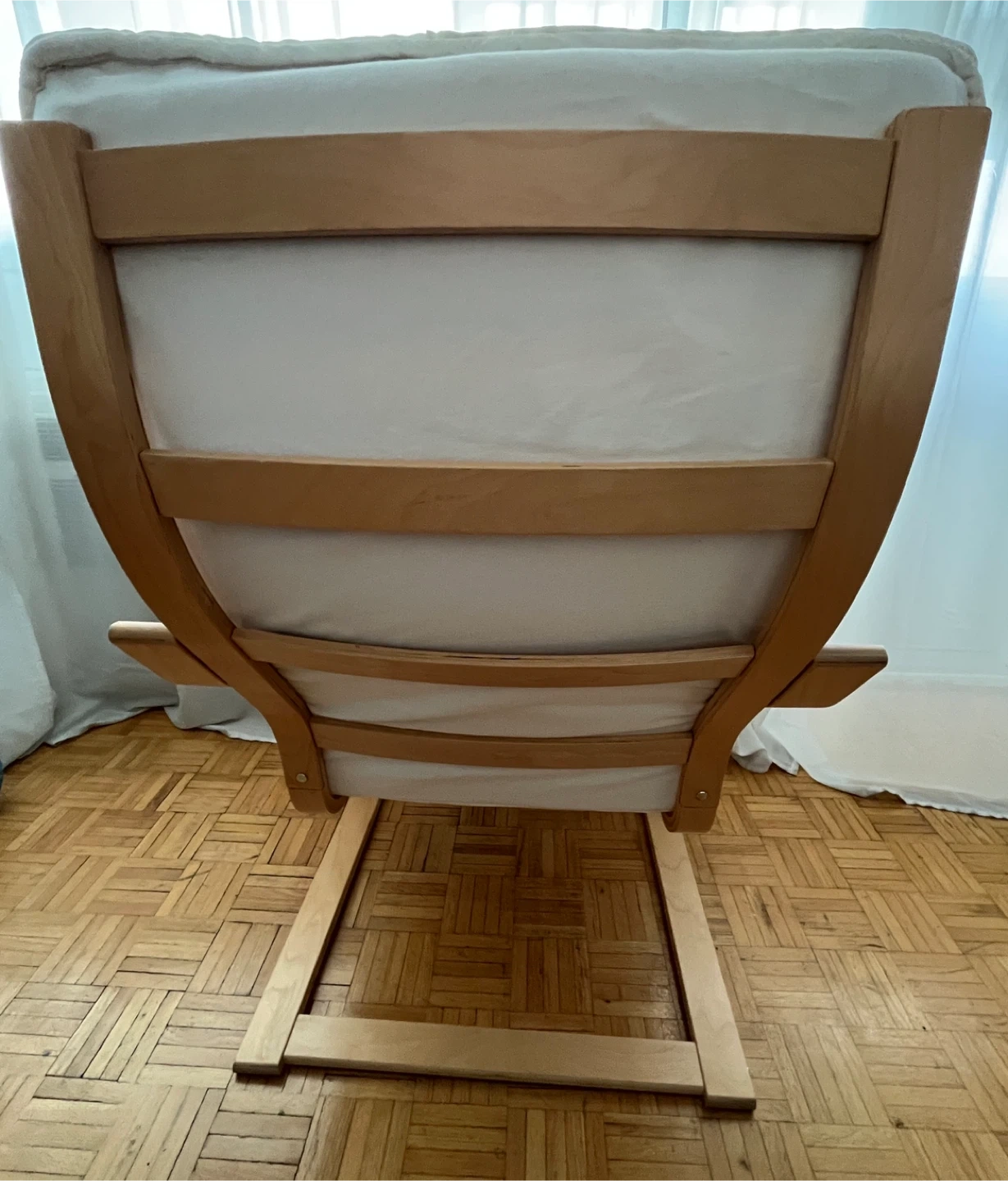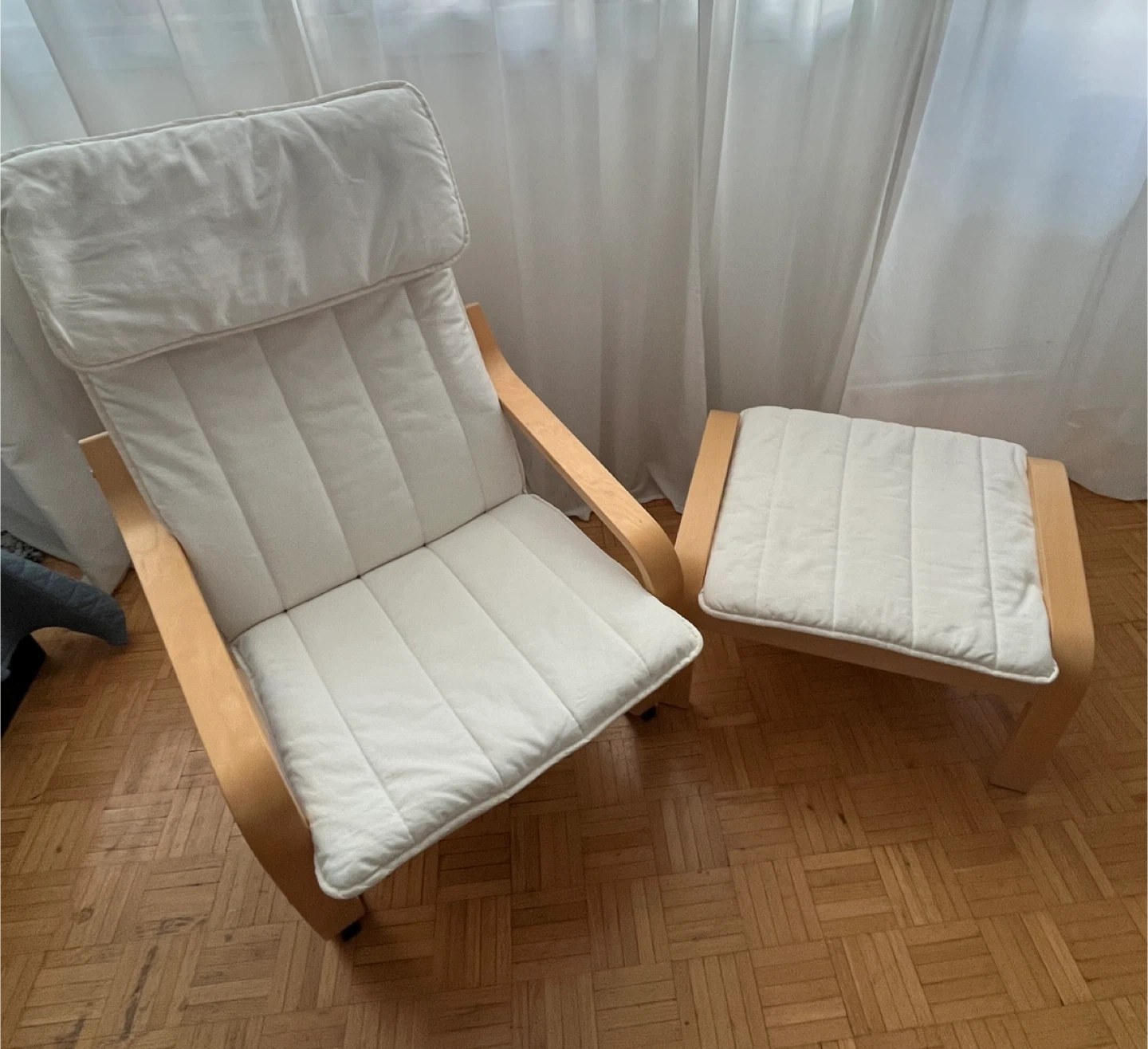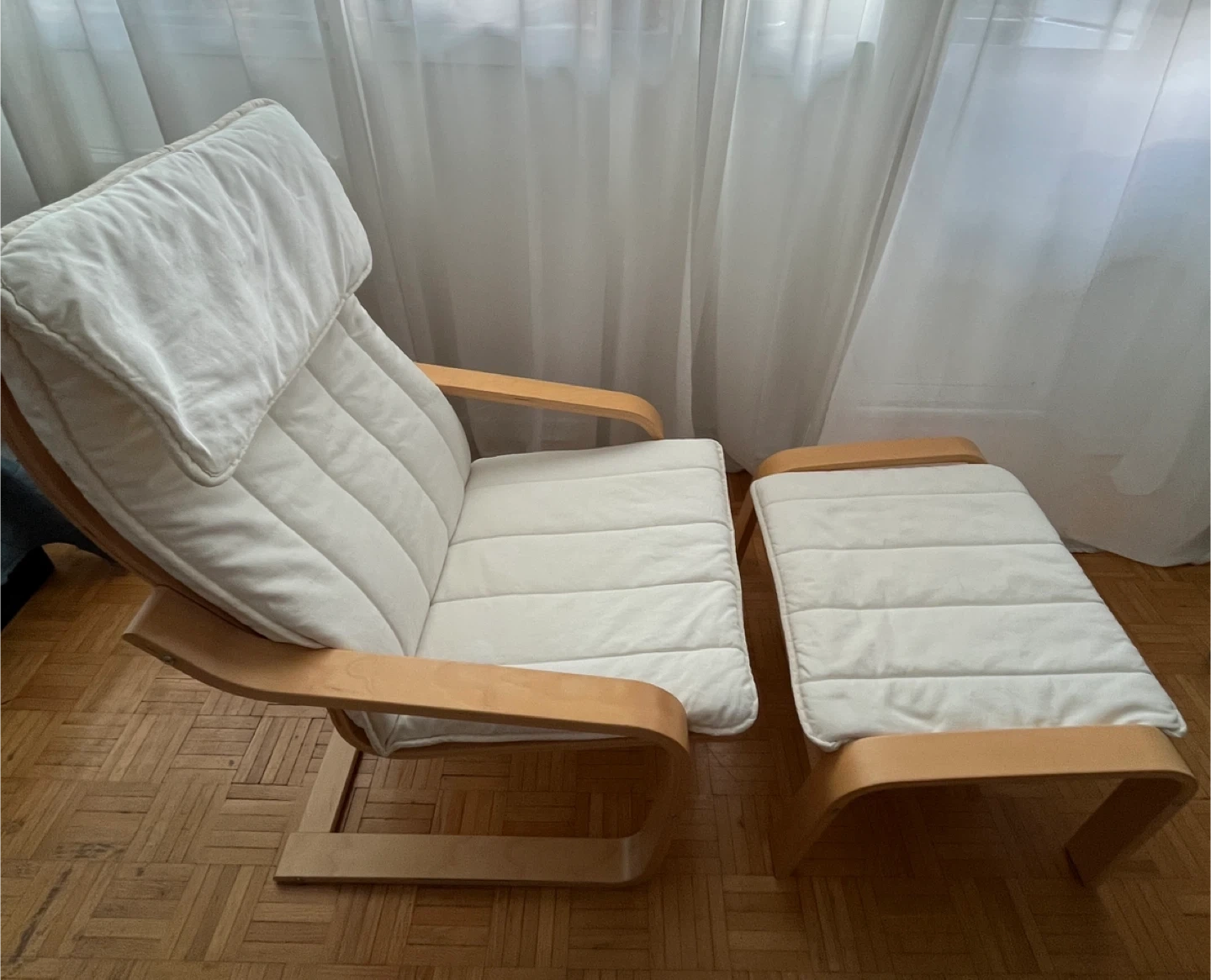 1000+IKEA Poang chair and ottoman set. The frame is birch veneer with white cushions in great condition. Delivery to reasonable distance $25 extra. Cost of delivery have to be paid in advance.