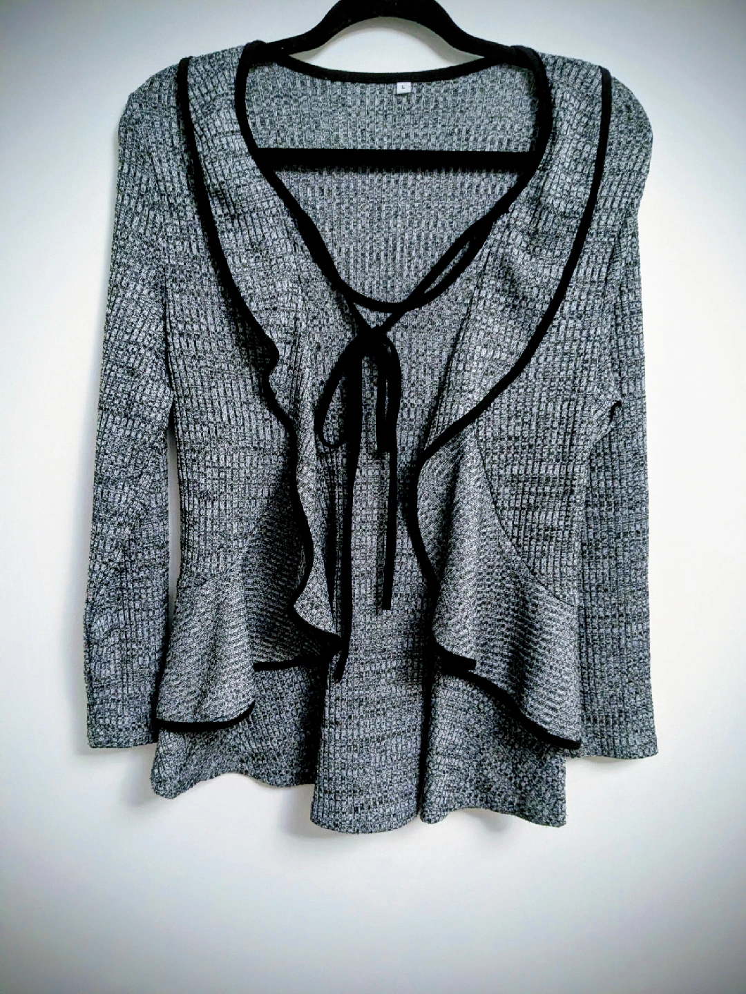 Selling a cute grey blouse with ruffle detailing! It's a size L but fits like a medium or both .and has a tie at the neck. Perfect for dressing up or down!