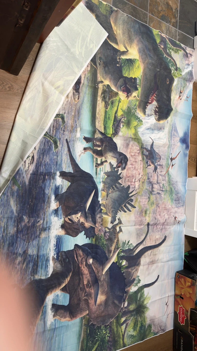 Selling a piece of fabric with a cool dinosaur print! It features various dinosaurs in a prehistoric scene. Great for a kid's room or a fun project. 85inches by56 inches