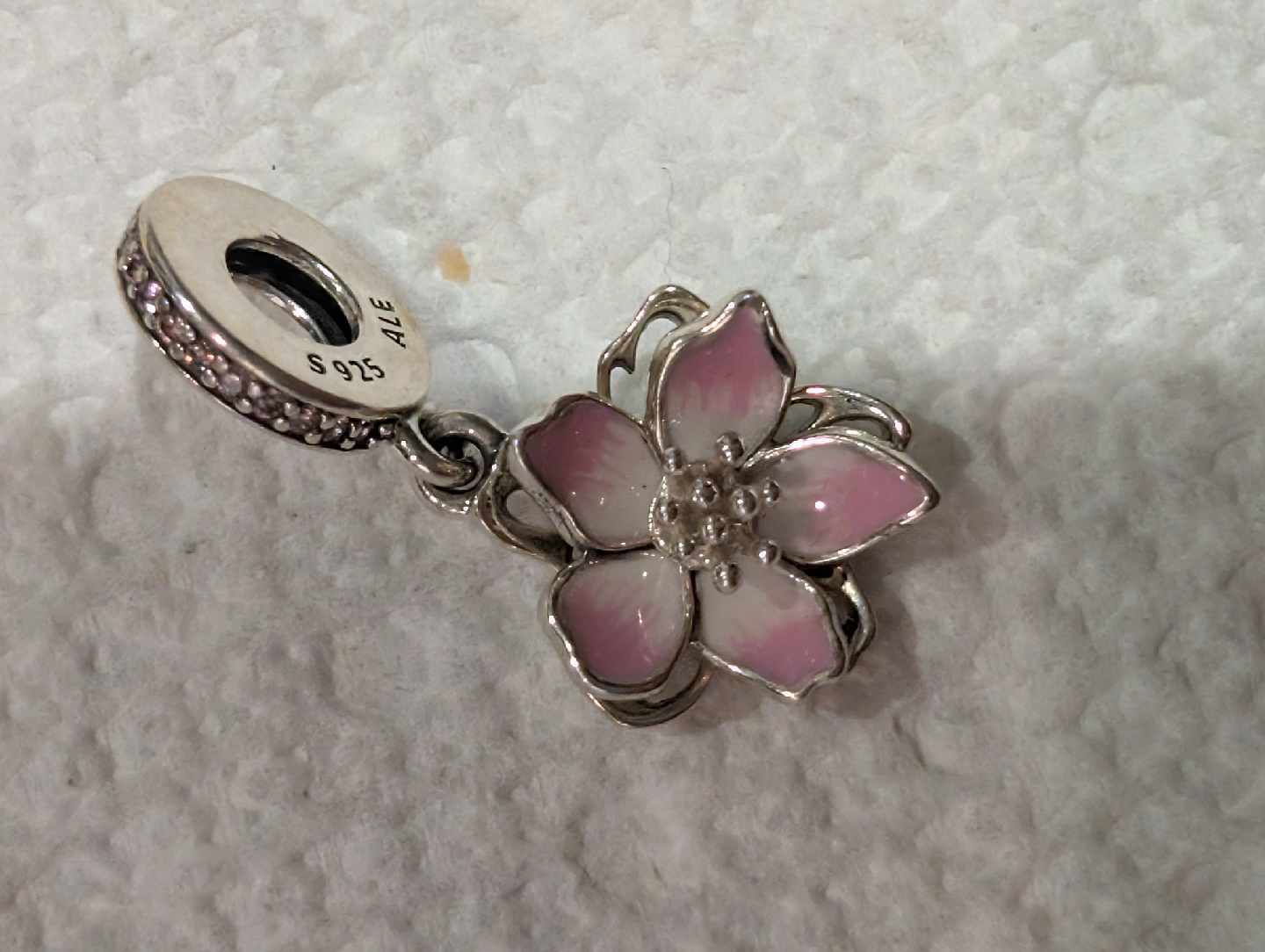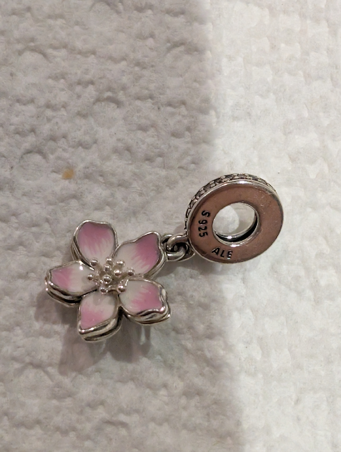 Selling a new authentic Pandora 925 sterling silver moveable pink cherry blossom dangle charm featuring a beautiful pink cherry blossom flower. It's stamped with S925 ALE, indicating its sterling silver composition. A lovely addition to any Pandora bracelet or necklace