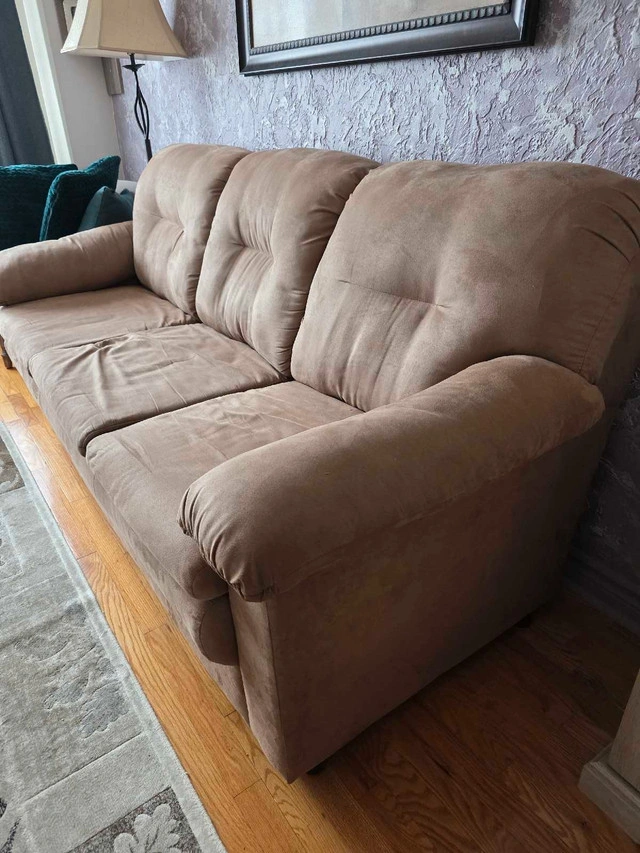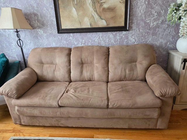 This comfortable 3-seat sofa is perfect for any living room. While it has been enjoyed and is in used condition, it still offers a cozy seating experience. This sofa features a soft, durable fabric and has a classic design that fits well with various decor styles.