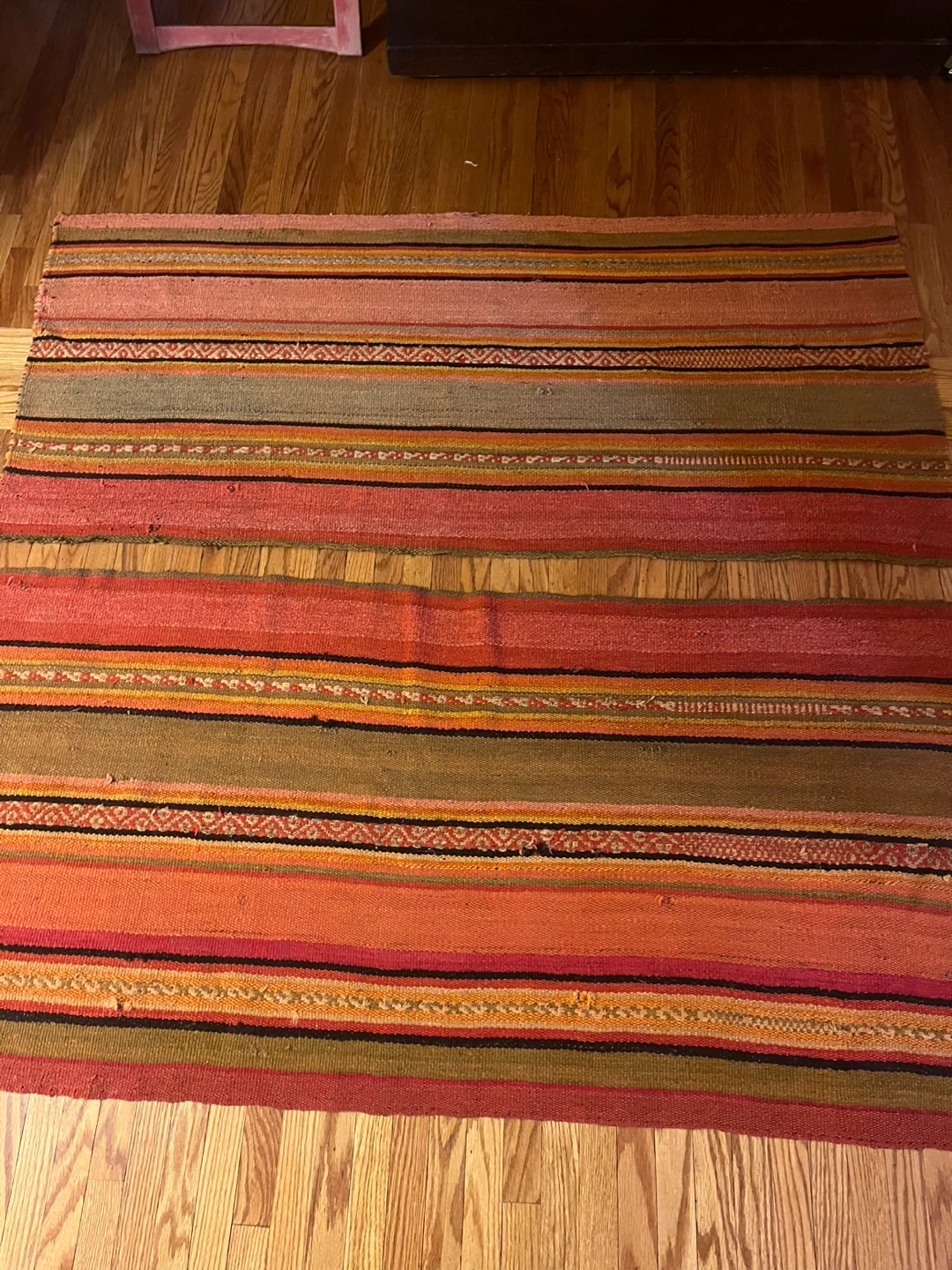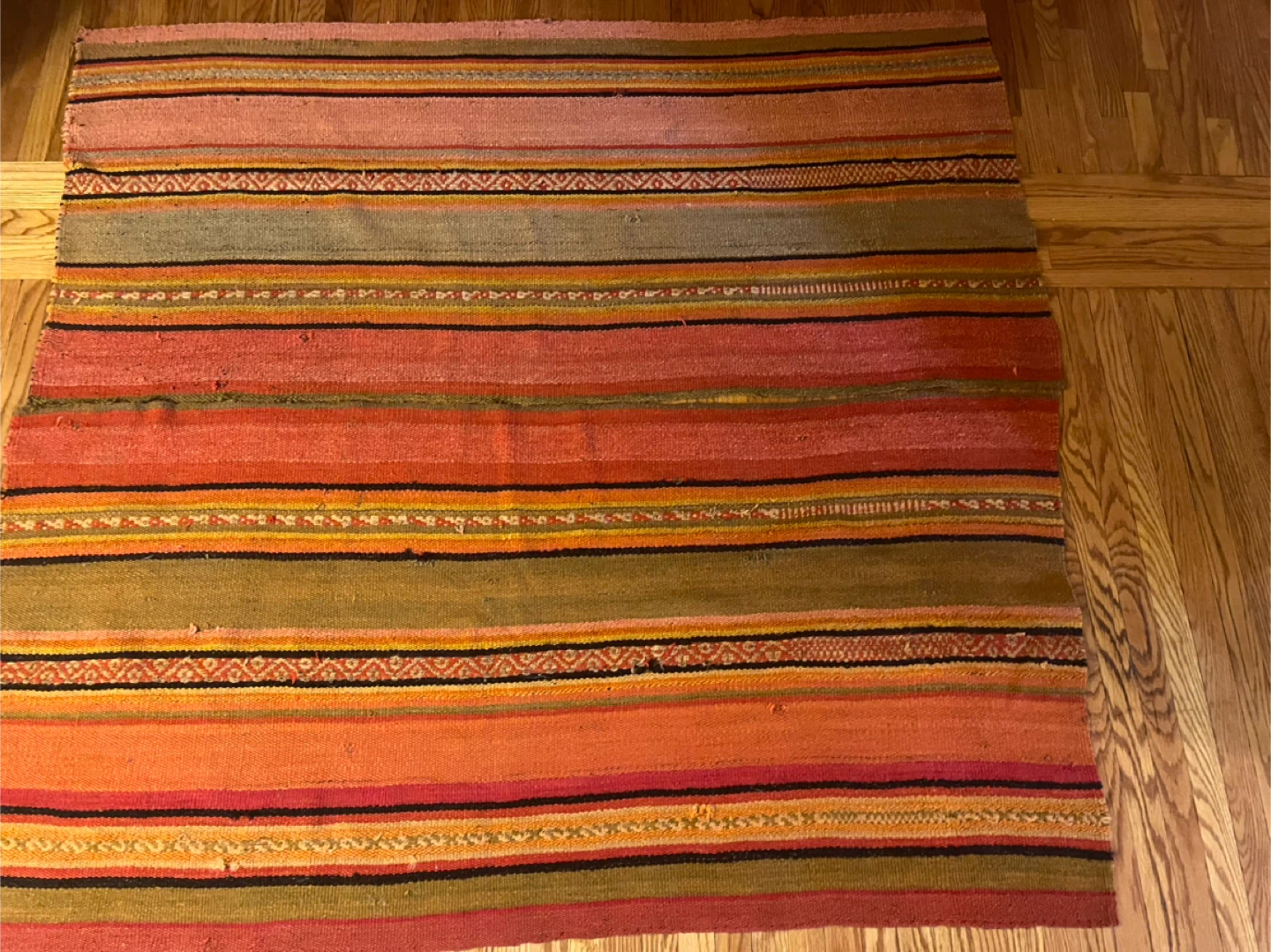These 2 hand woven rugs 57”x28” can be used as runners in a hallway or next to a bed, or you can sow them together to make a square rug. The vibrant colours cheer up any room.