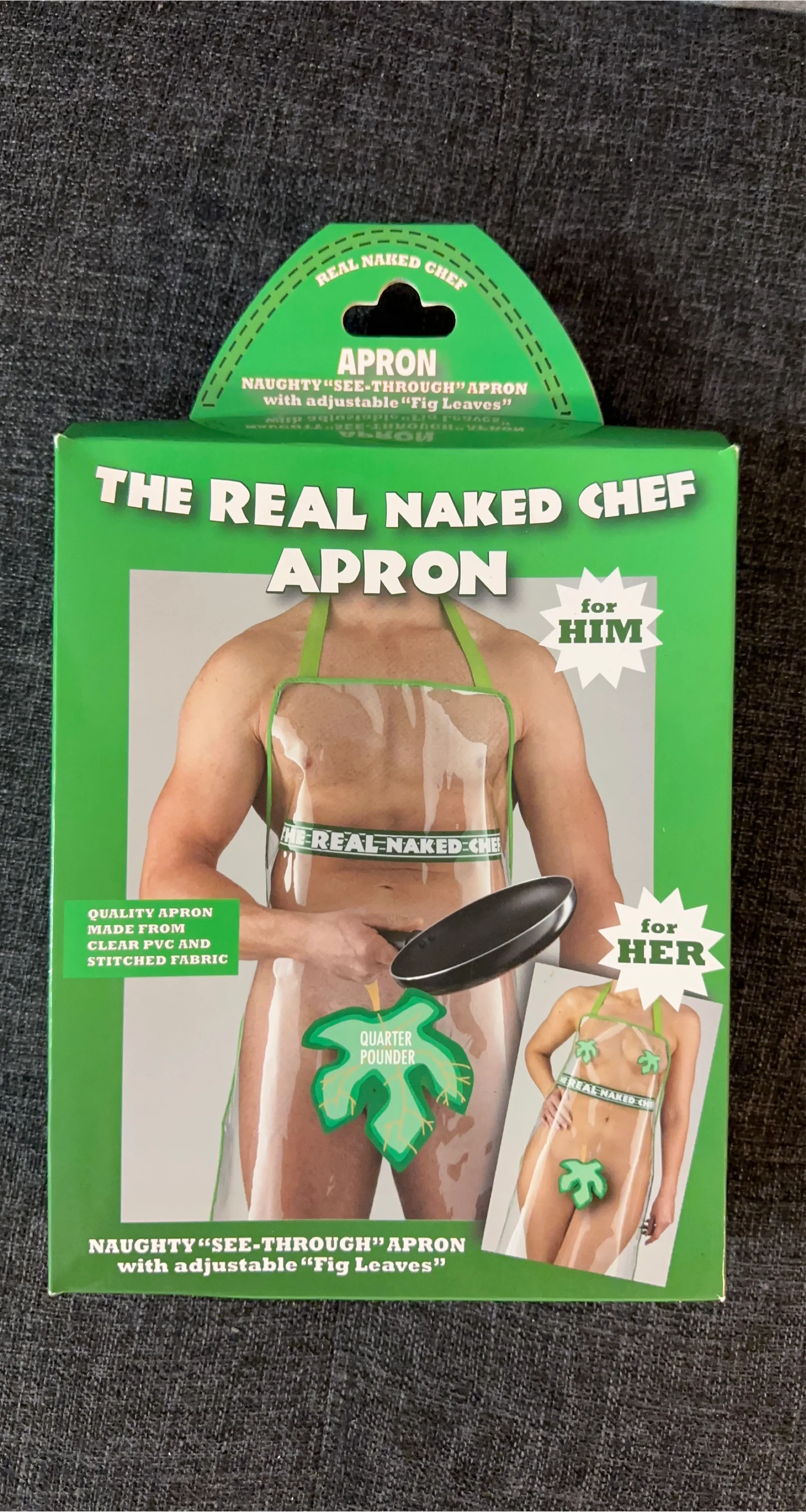 This is The Real Naked Chef Apron, a naughty see-through apron with adjustable fig leaves! It's a quality apron made from clear PVC and stitched fabric. Perfect for him or her!