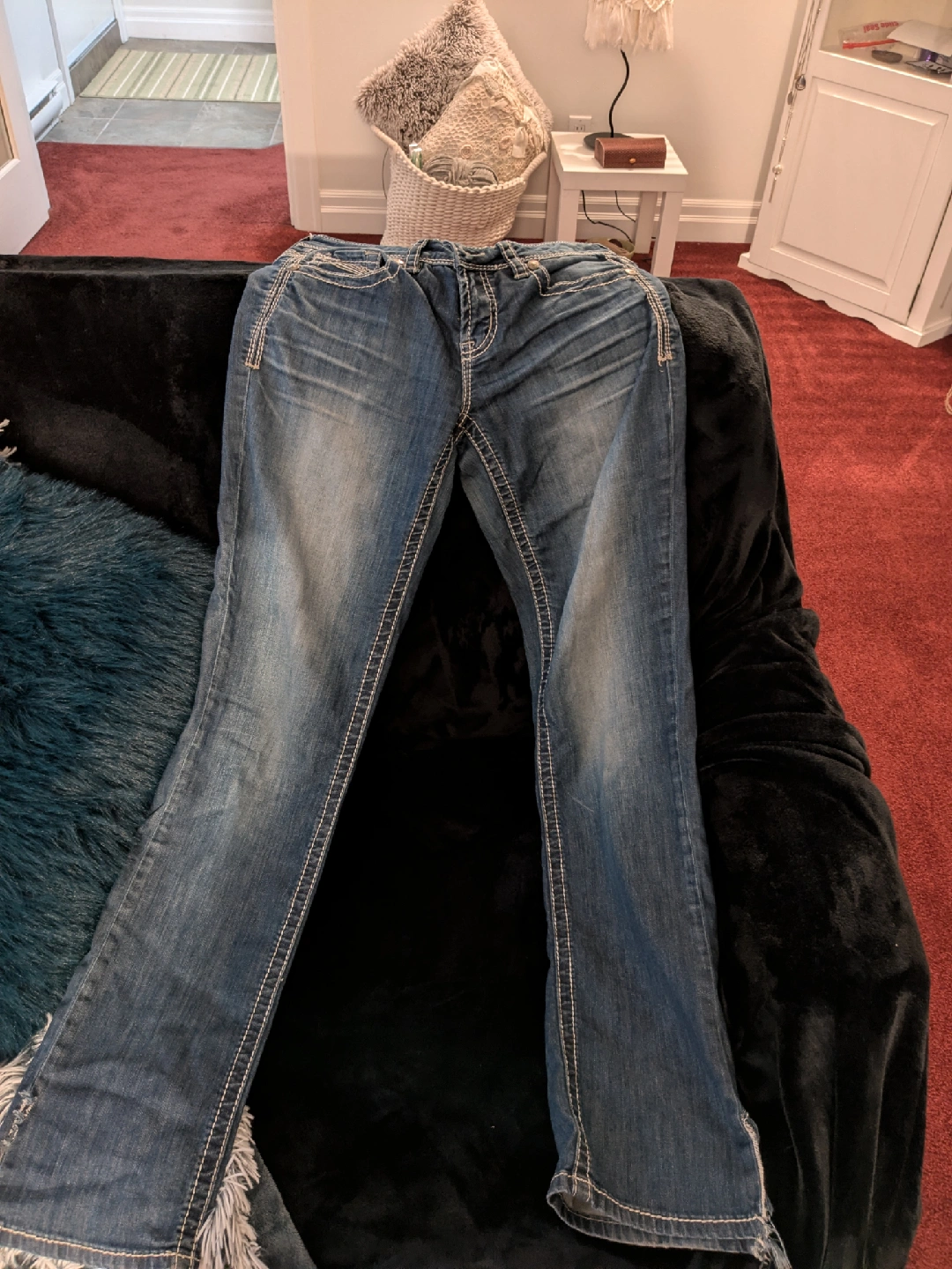 Selling a pair of Wrangler jeans in size 11/12! They're in great condition and ready for a new home. The denim has a classic wash and the back pockets have a decorative design. Perfect for everyday wear! stretch material. Jean Warehouse brand.