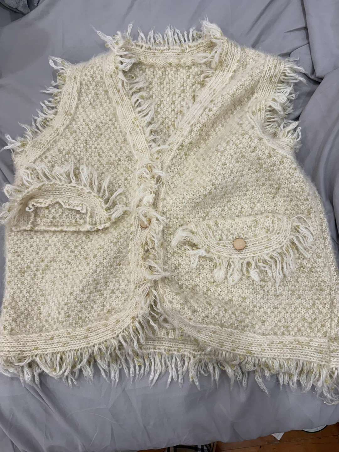 25Cozy up with this unique fringe knit vest! It's a cream colour and features a stylish, textured knit design with fun fringe detailing around the edges and pockets. Perfect for layering and adding a bit of flair to any outfit