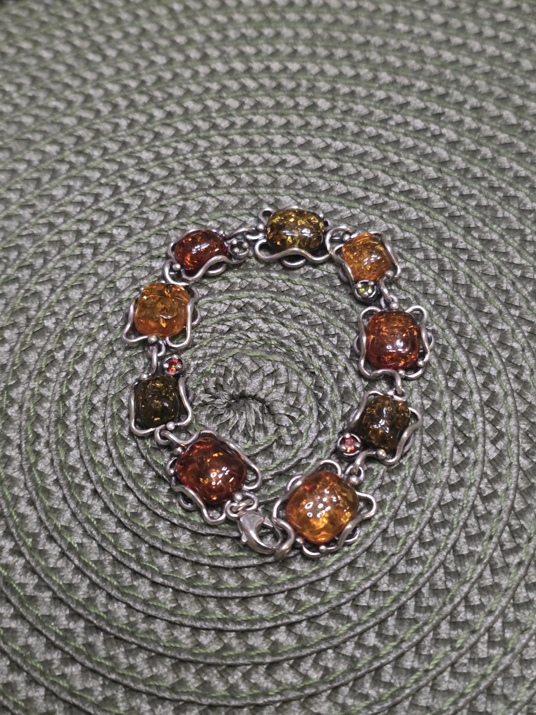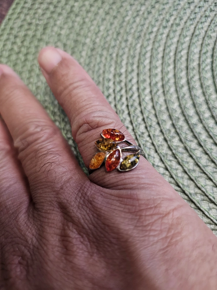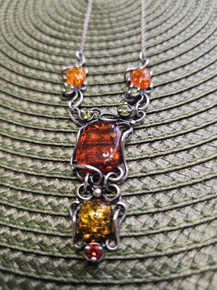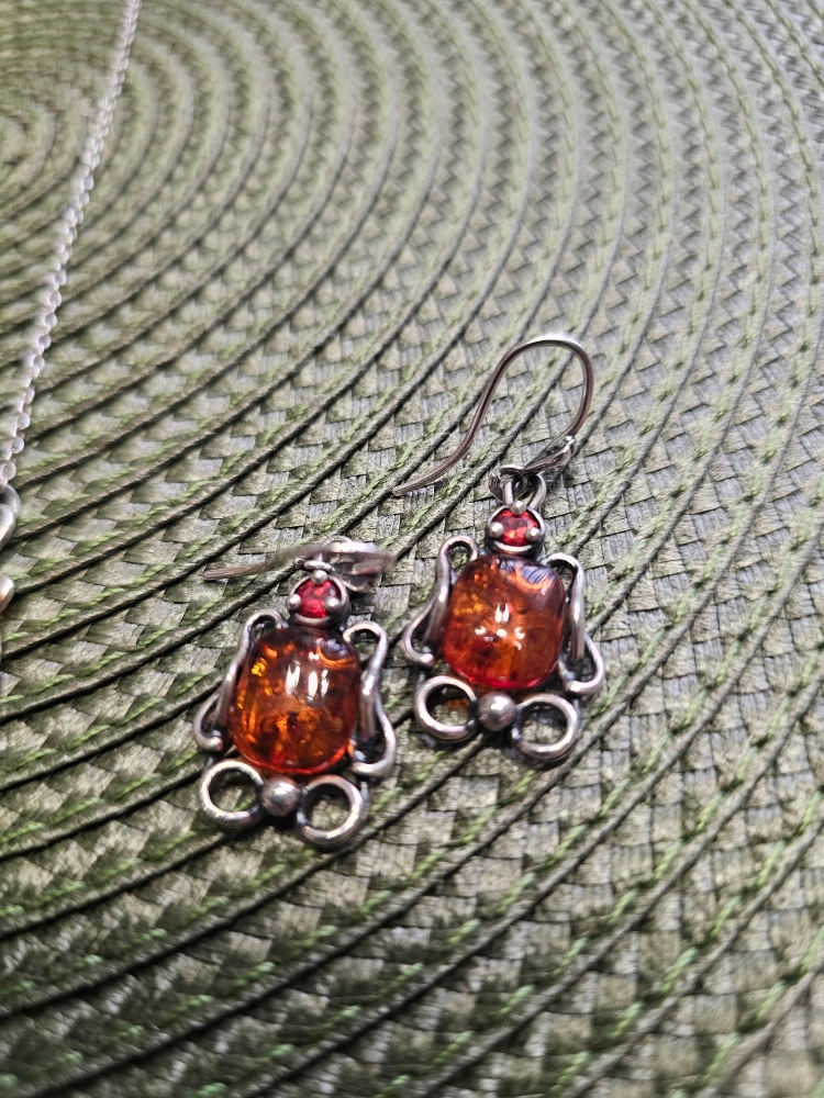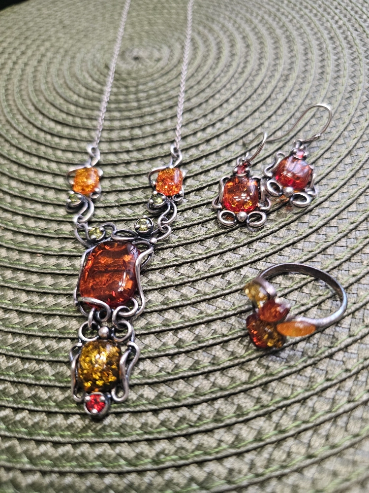 Beautiful amber jewelry set featuring a ring, earrings, bracelet and necklace. The amber stones have lovely warm tones and are set in what appears to be a silver-tone metal. Perfect for adding a touch of elegance to any outfit! stamped 925