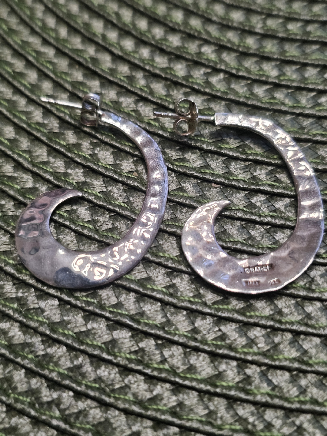 These are a pair of G.I.A.N.I. sterling silver earrings. They have a unique hammered texture and a curved, open design. They are marked 'G.I.A.N.I THAI 925'.
