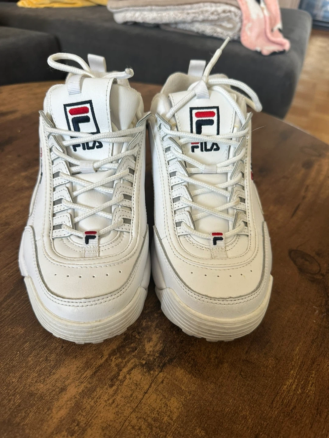 10Selling a pair of Fila in white! These are a stylish and comfortable choice for everyday wear. They have a unique design and are in great condition!