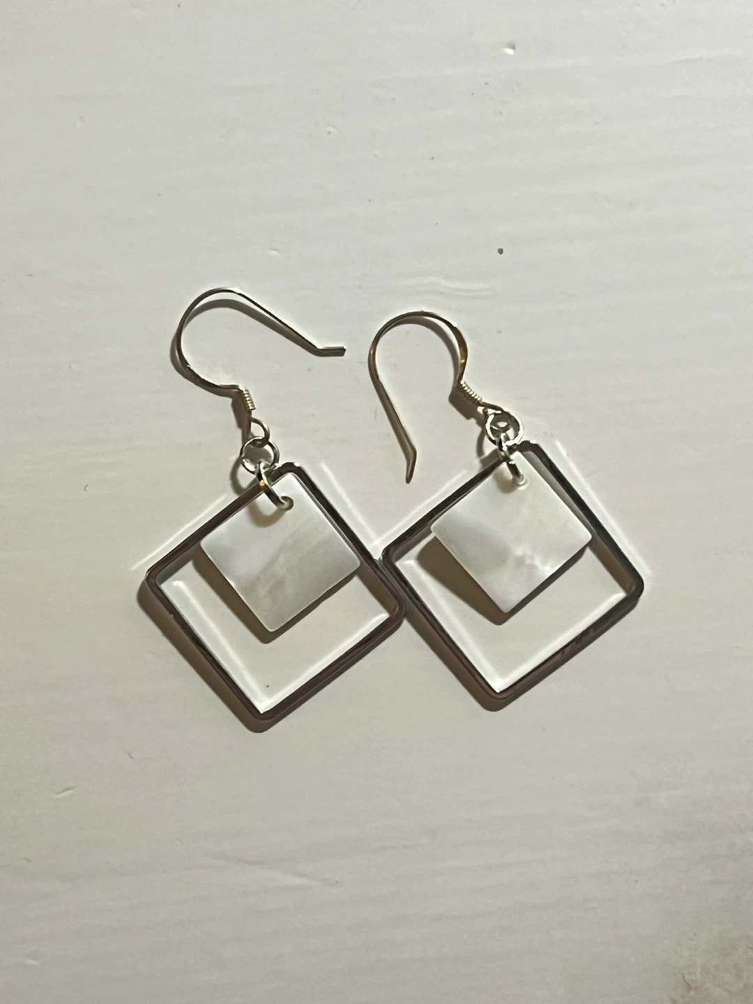 62These are a pair of stylish square dangle earrings. They feature a silver frame with a white square insert. Great for adding a touch of modern elegance to any outfit! Cash only Pickup only