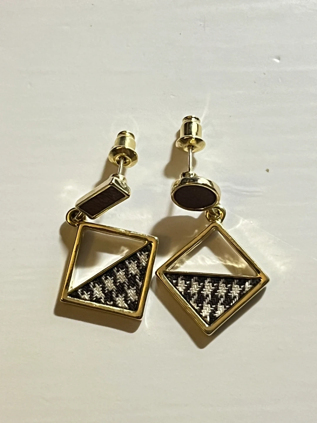 62Cute pair of geometric drop earrings! One is a square and the other is a diamond shape. Both have a gold tone and a black and white patterned fabric detail Cash only Pickup only
