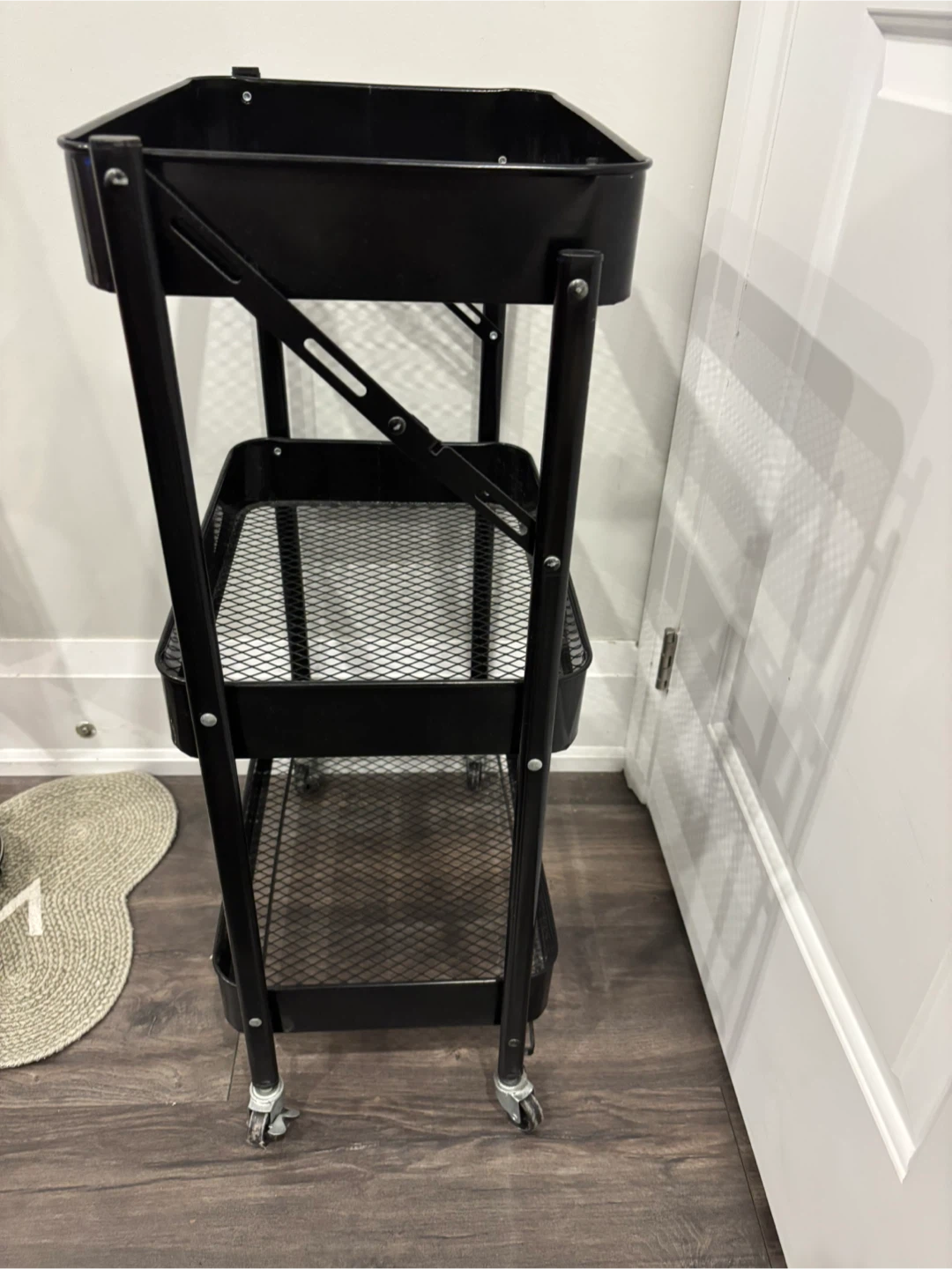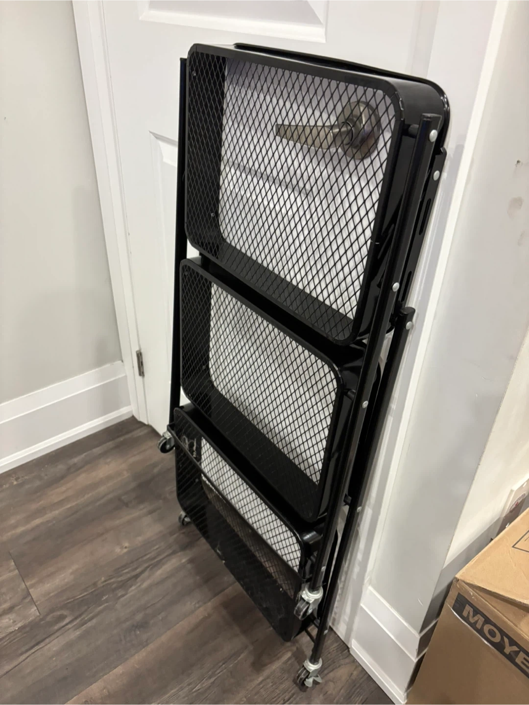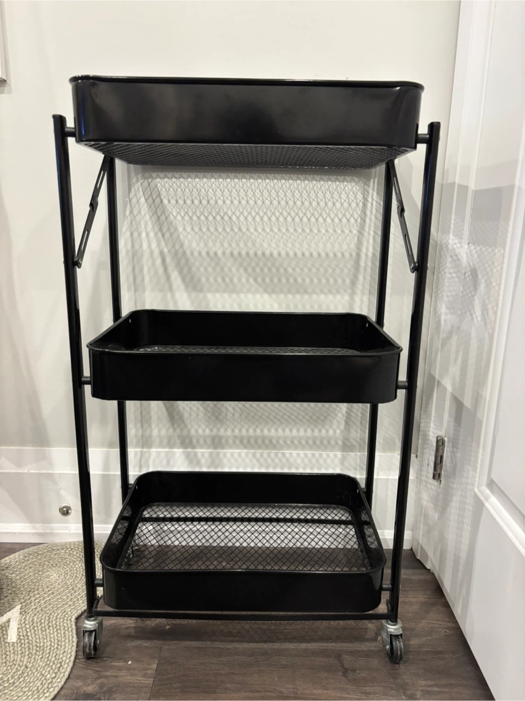 This black 3-tier rolling cart is perfect for any room! It's in great condition and ready to help you organize your space and folds when not it use!