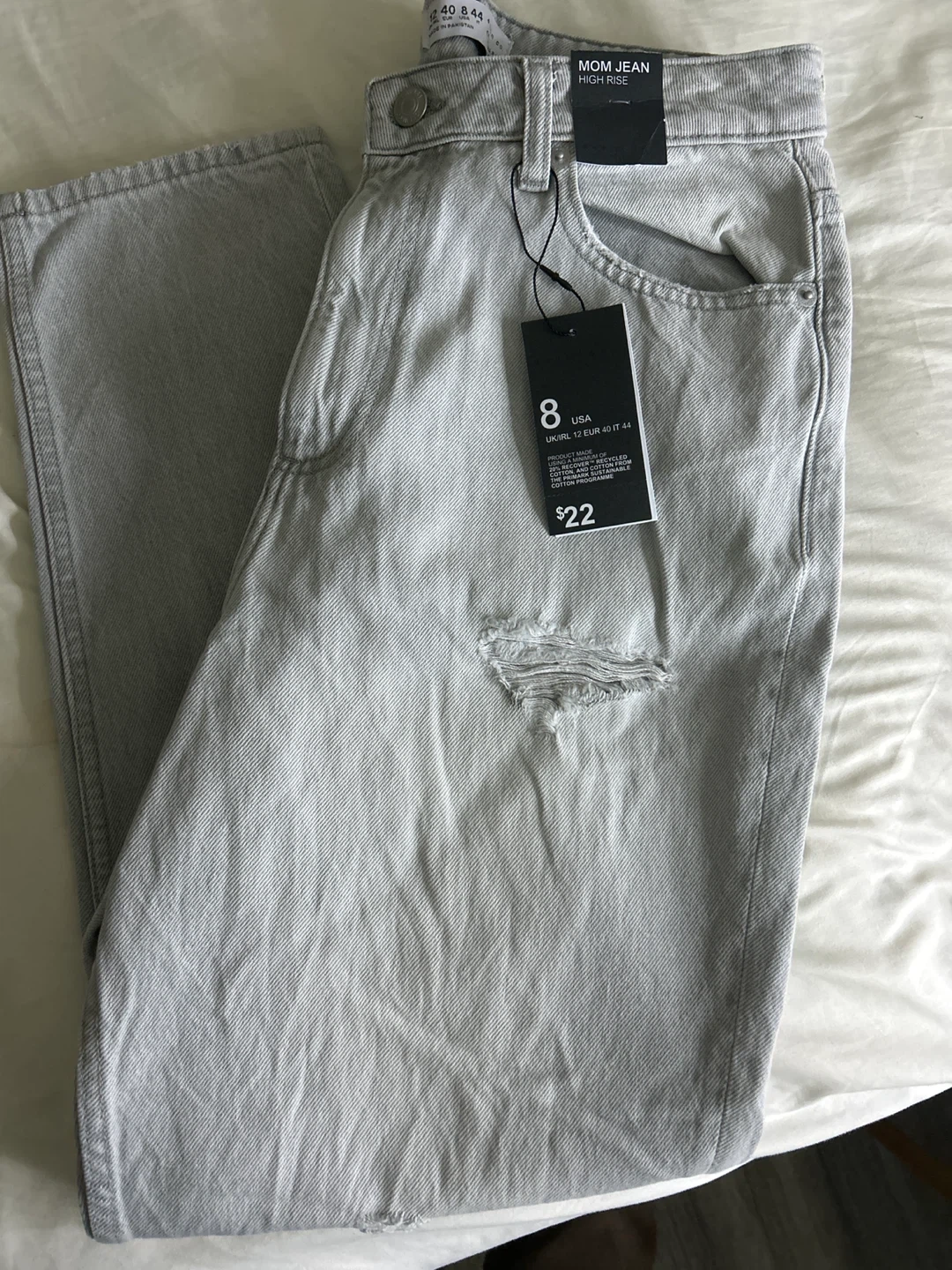 Selling a pair of new with tags mom jeans in size 8! They're a stylish high-rise fit and have a cool, distressed look with rips. The original price tag of $22 is still attached!