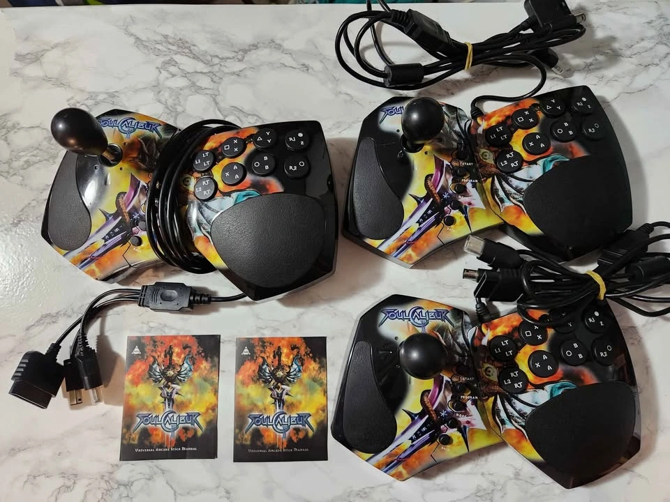 For sale are 3 official Soul Calibur II Universal Arcade Sticks with manuals, compatible with PlayStation 2, original Xbox, and Nintendo GameCube. A great piece for fighting game fans, collectors, or anyone who prefers the authentic arcade feel at home.
